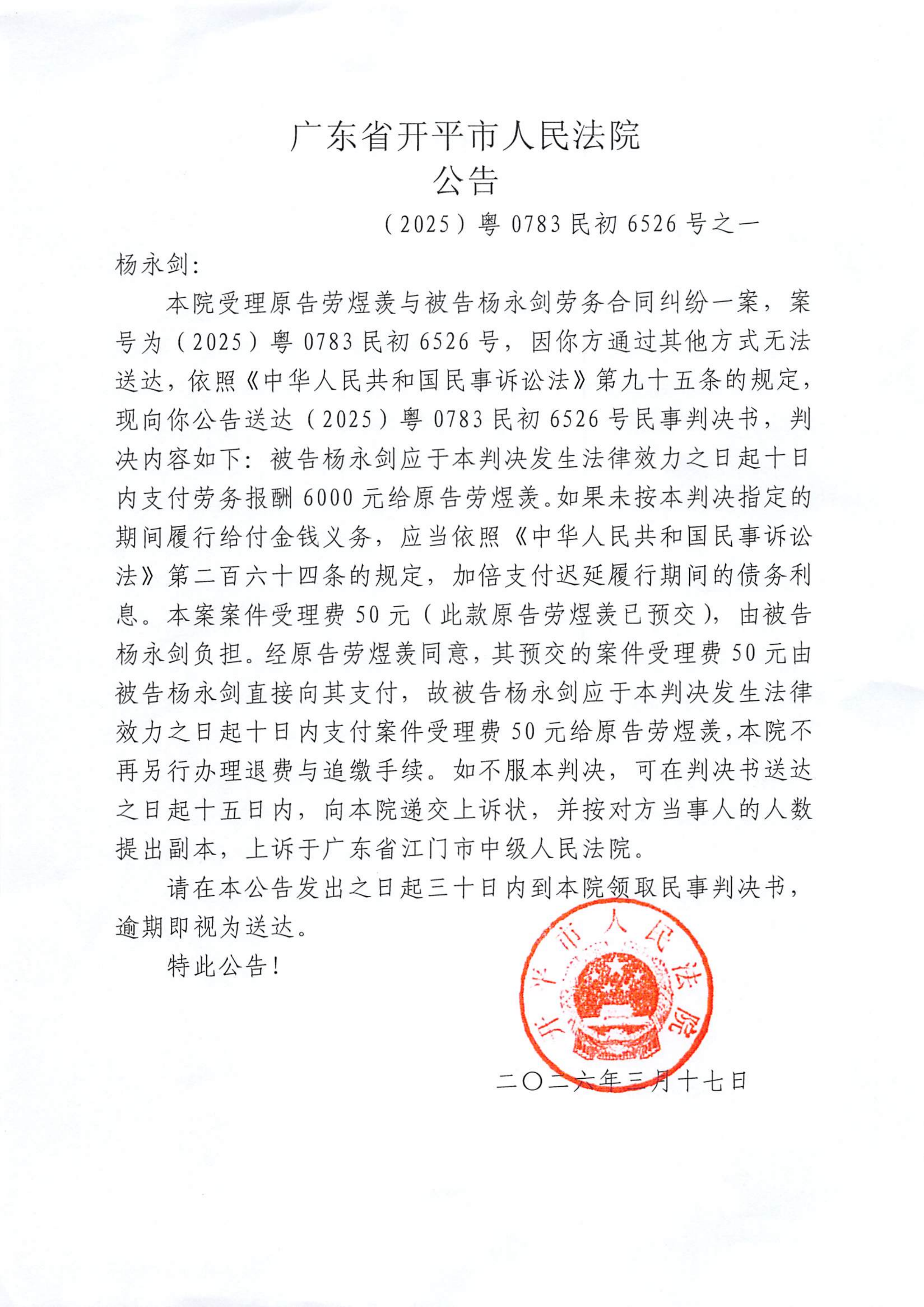 附件:(2025)粤0783民初6526号之一 杨永剑 判决公告.pdf