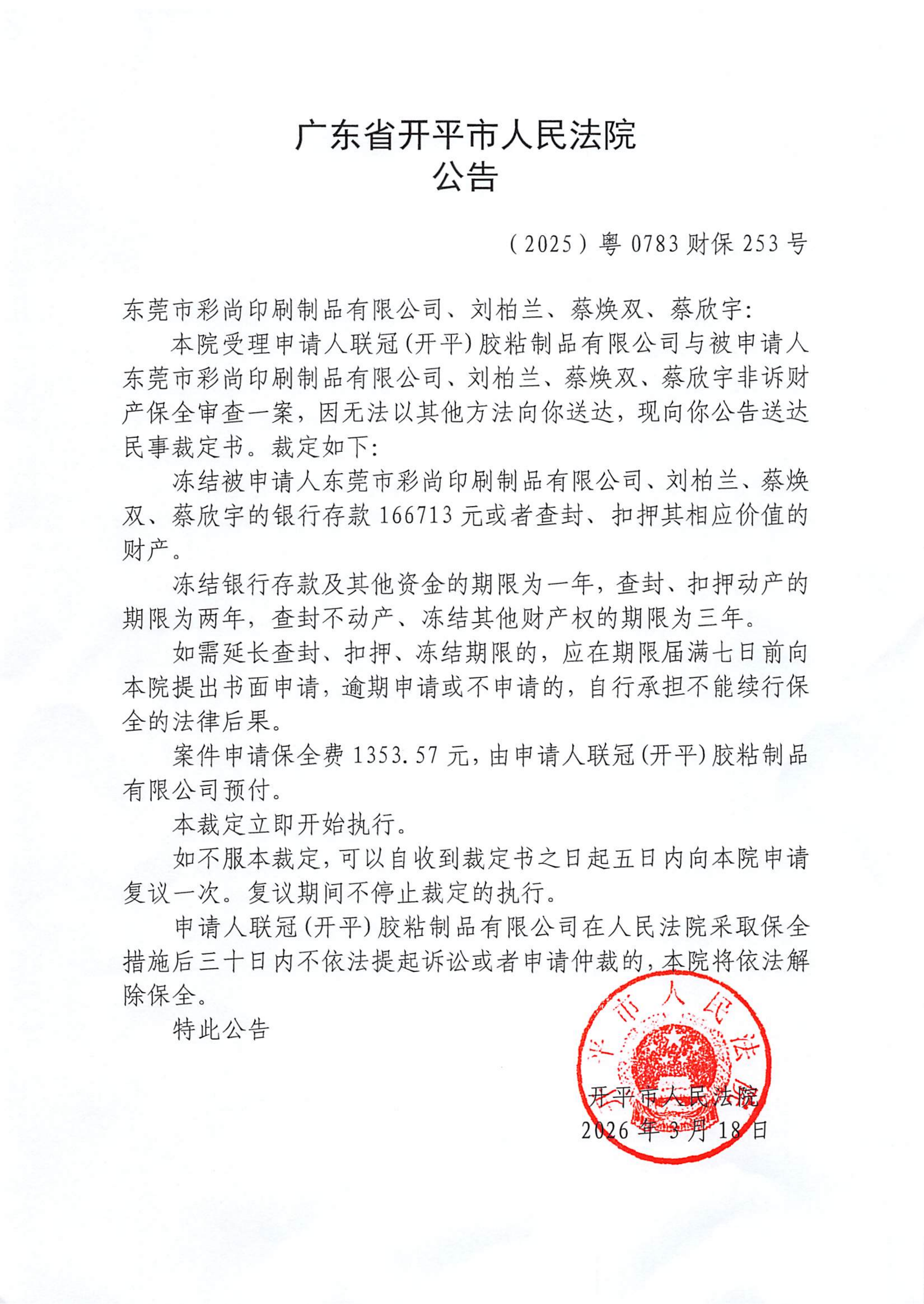 附件:(2025)粤0783财保253号 东莞市彩尚印刷制品有限公司、刘柏兰、蔡焕双、蔡欣宇 裁定公告.pdf
