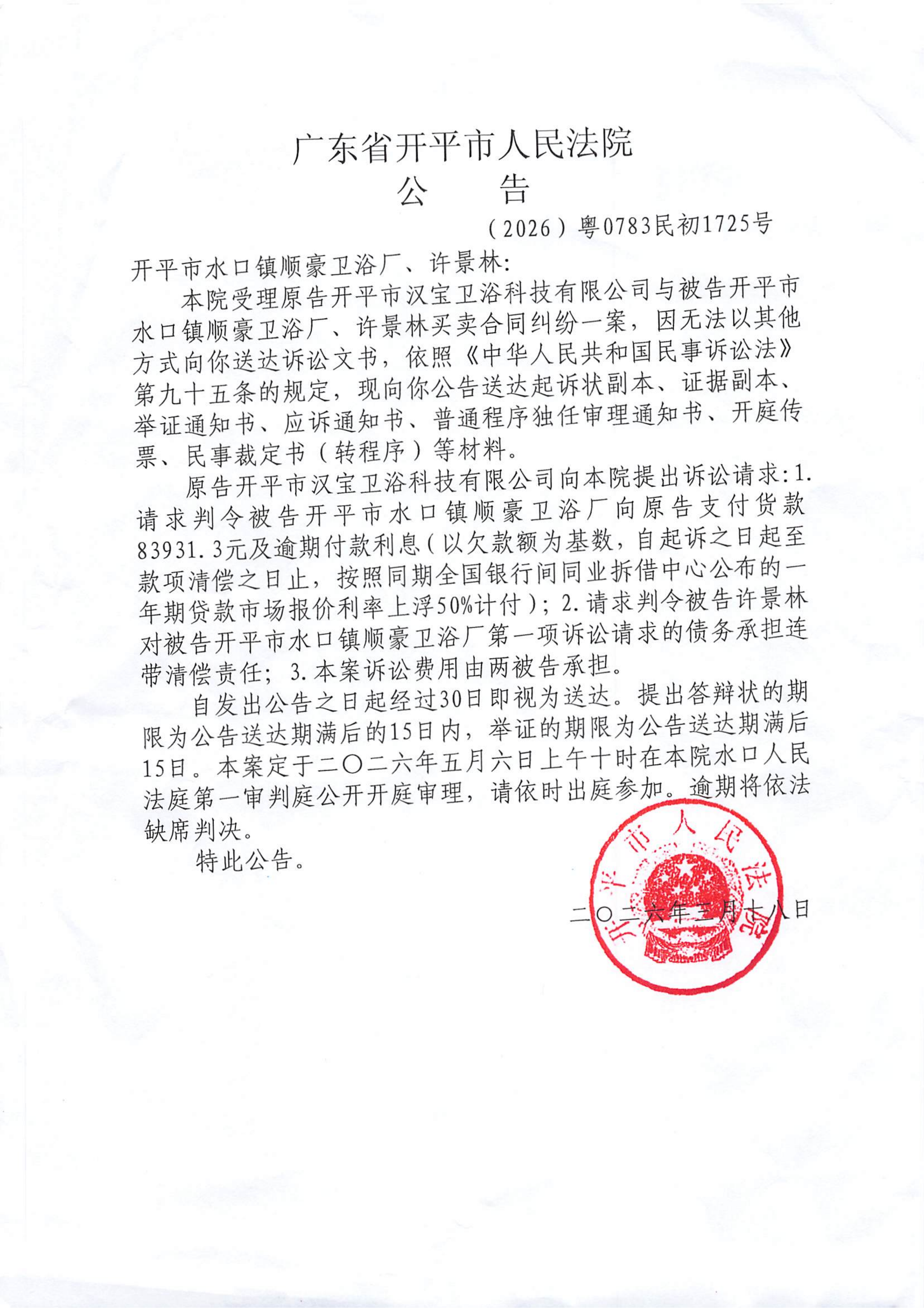 附件:(2026)粤0783民初1725号 开平市水口镇顺豪卫浴厂、许景林 开庭公告.pdf