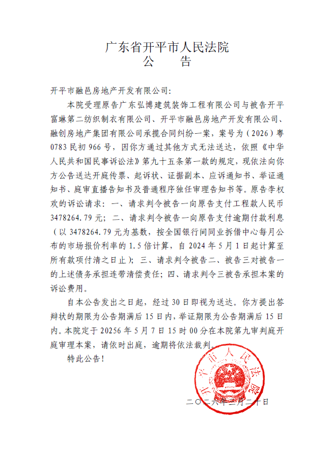 主办:开平市人民法院 网址: www.kpcourt.gov.cn 地址:广东省开平市沿江东路82号开平市人民法院 邮编:529300