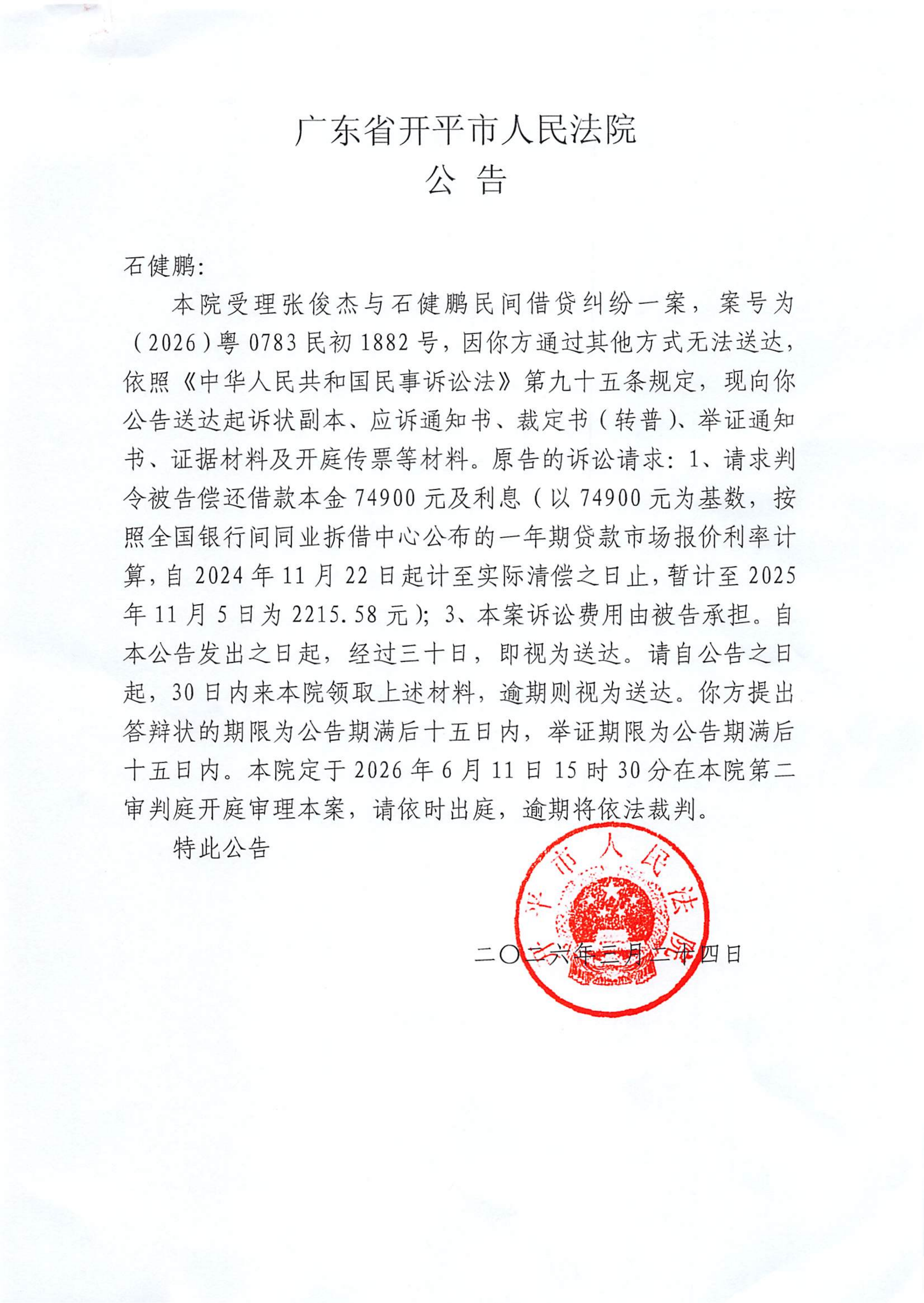 附件:(2026)粤0783民初1882号 石健鹏 开庭公告.pdf