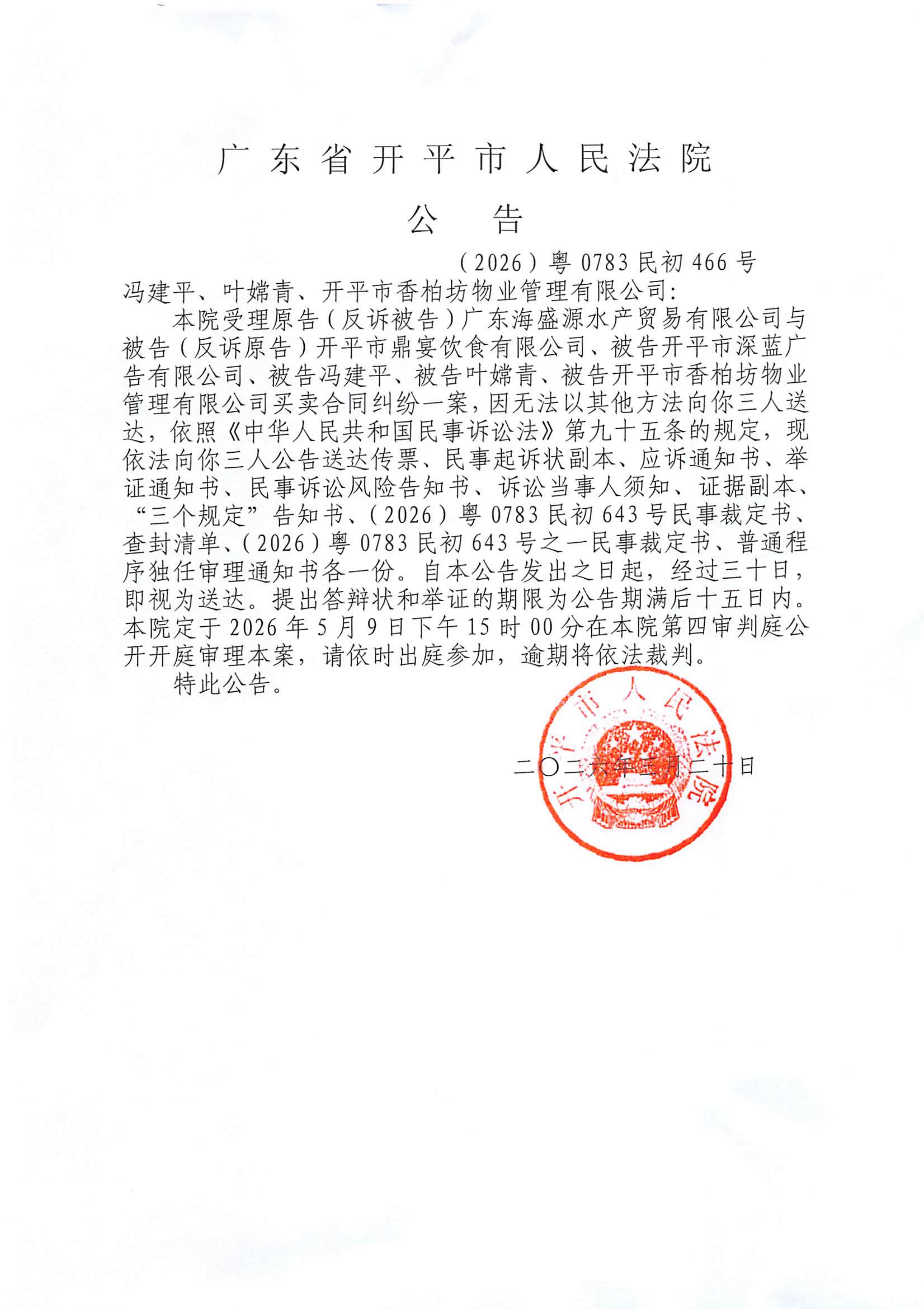 附件:(2026)粤0783民初466号 冯建平、叶嫦青、开平市香柏坊物业管理有限公司 开庭公告.pdf