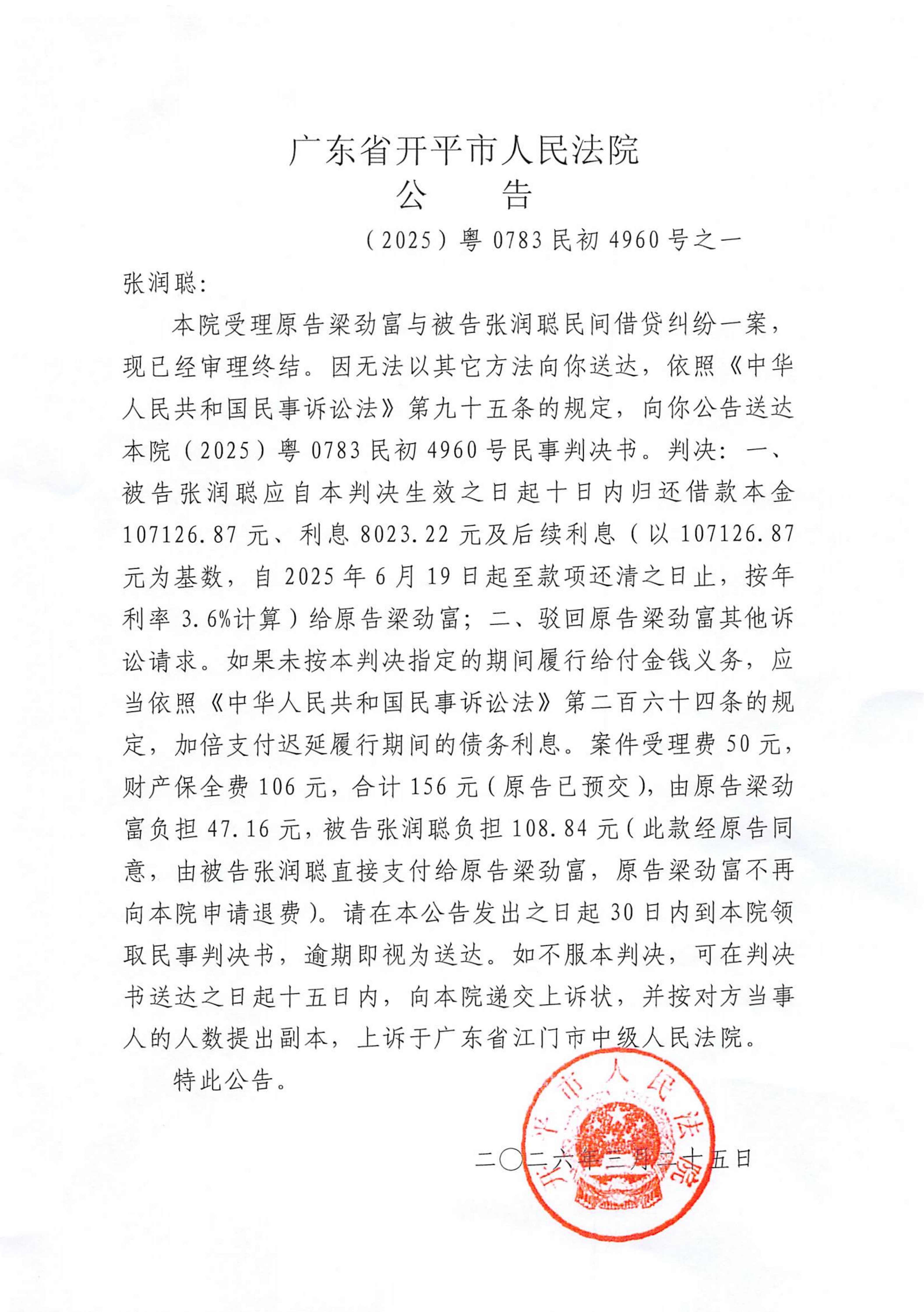 附件:(2025)粤0783民初4960号之一 张润聪 判决公告.pdf