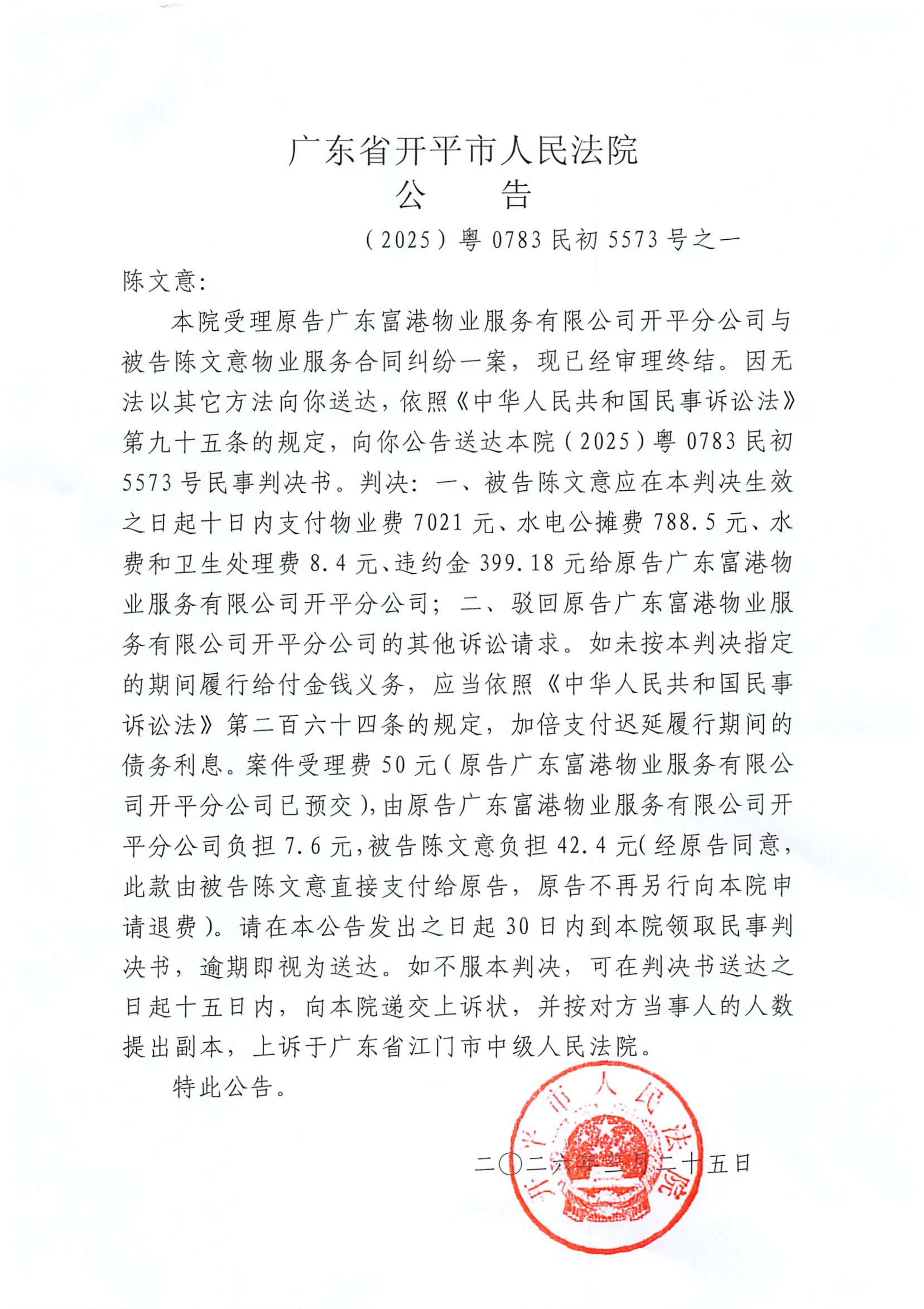附件:(2025)粤0783民初5573号之一 陈文意 判决公告.pdf