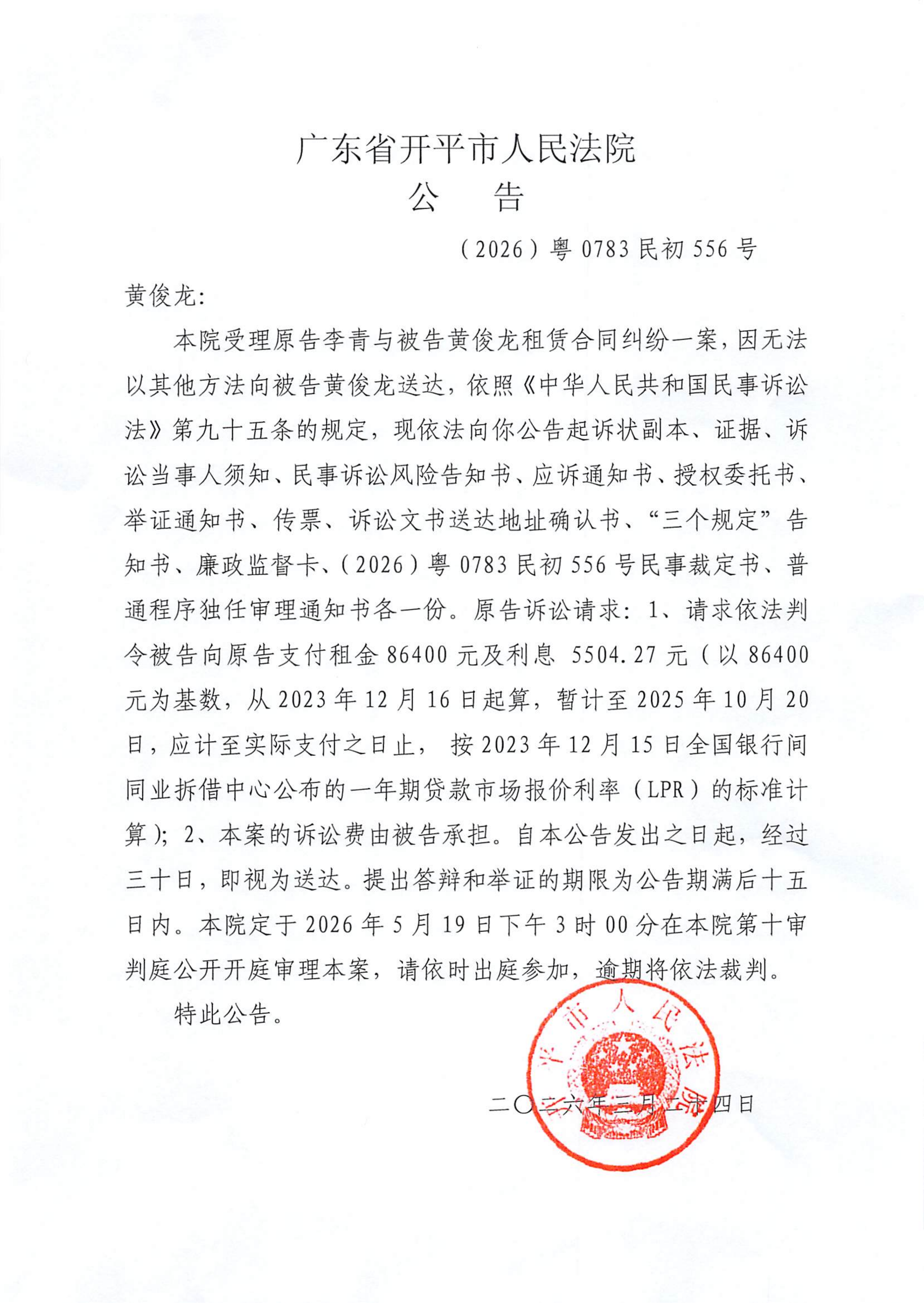 附件:(2026)粤0783民初556号 黄俊龙 开庭公告.pdf