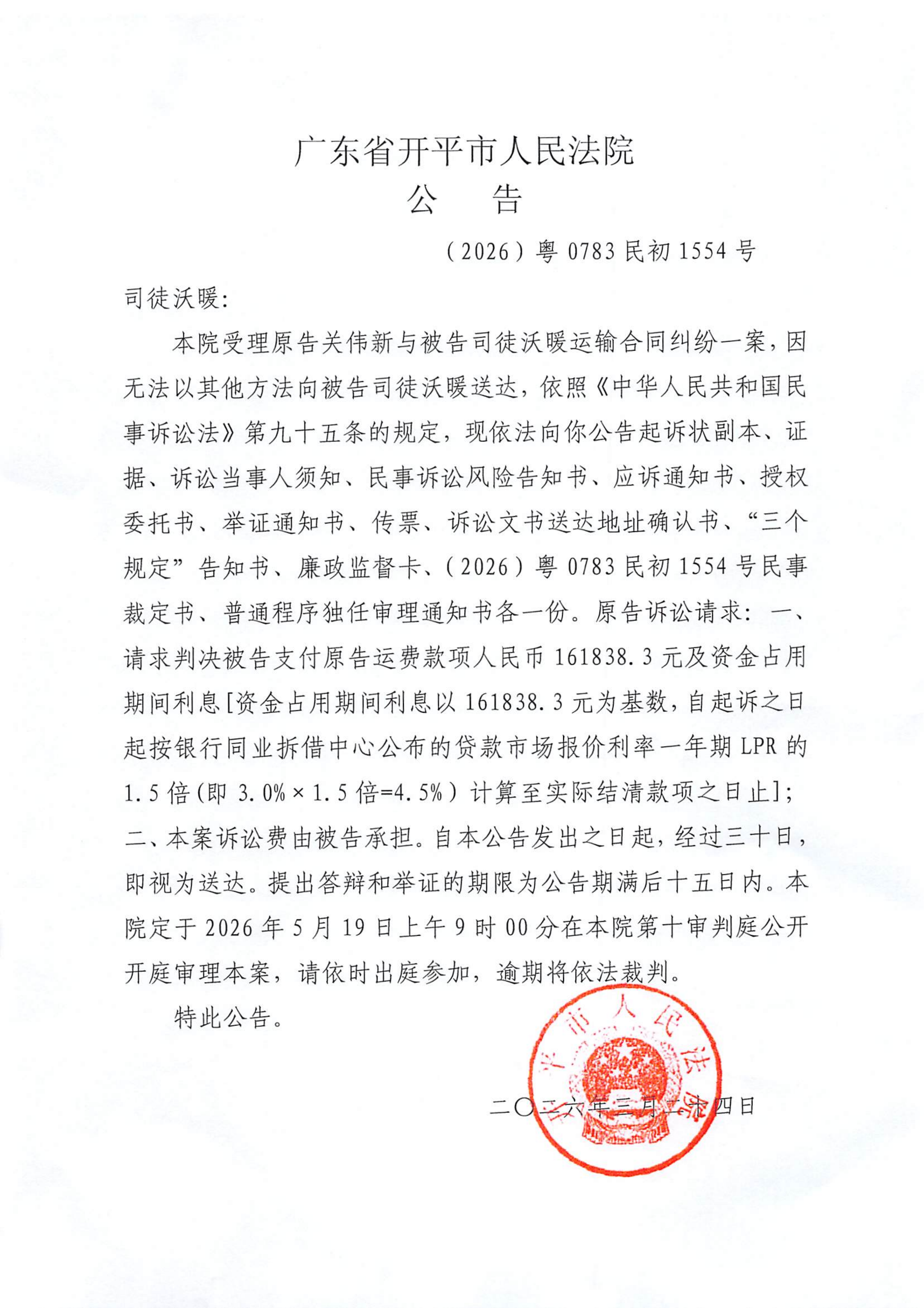 附件:(2026)粤0783民初1554号 司徒沃暖 开庭公告.pdf