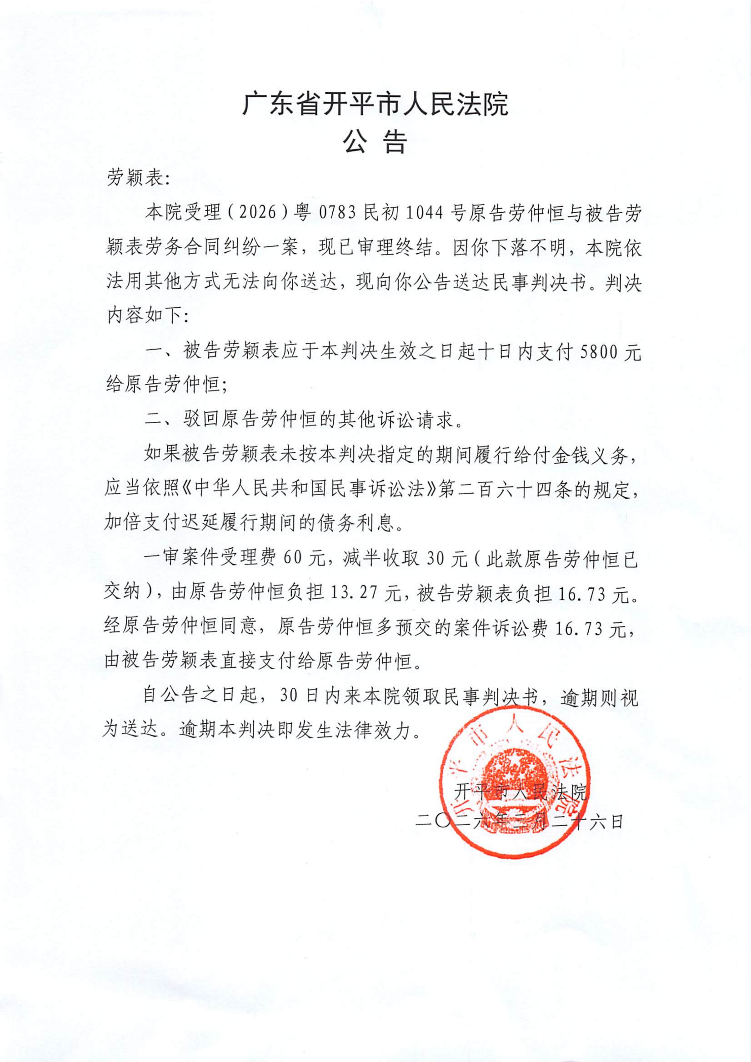 附件:(2026)粤0783民初1044号 劳颖表 判决公告.pdf