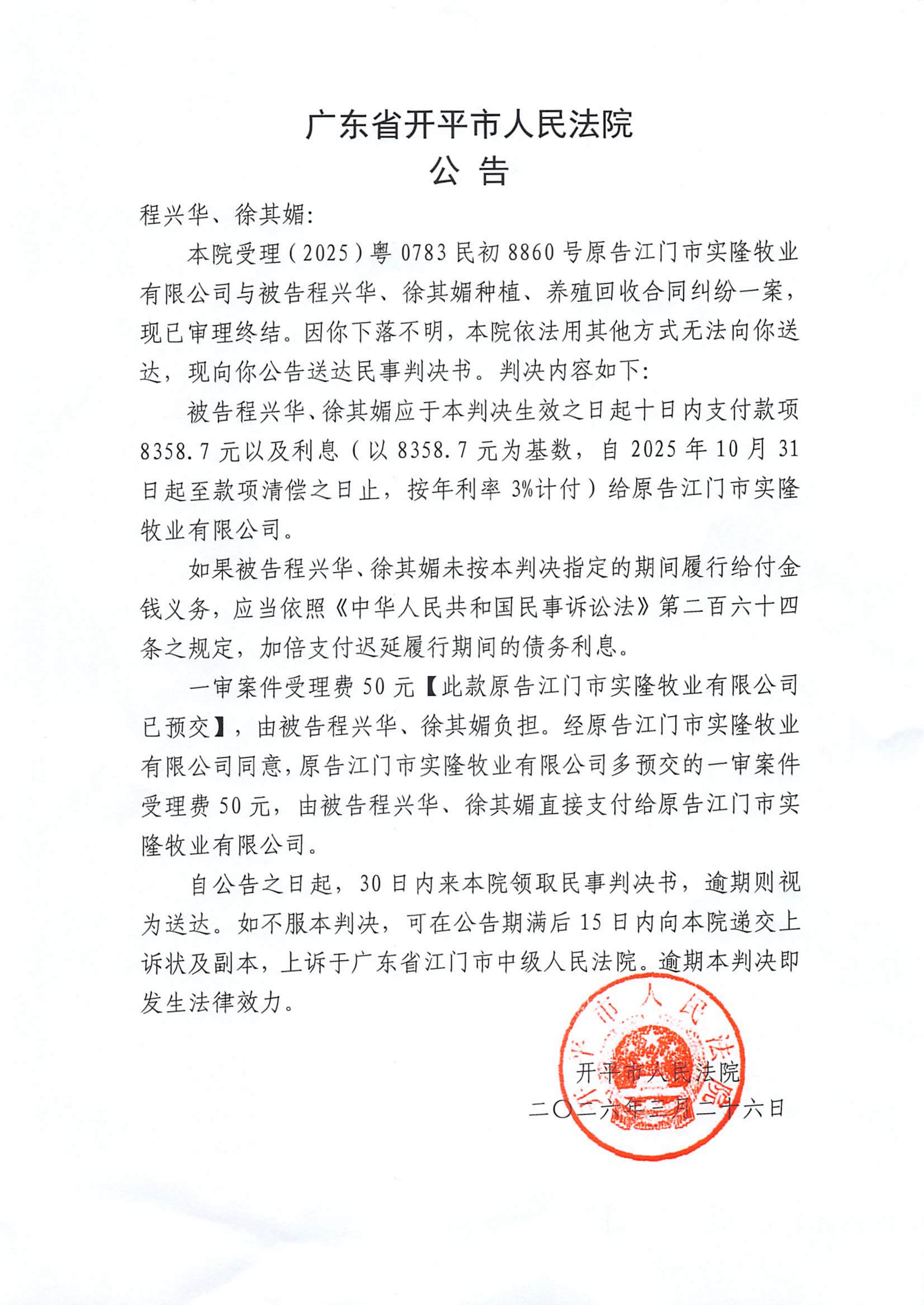 附件:(2025)粤0783民初8860号 程兴华、徐其媚 判决公告.pdf
