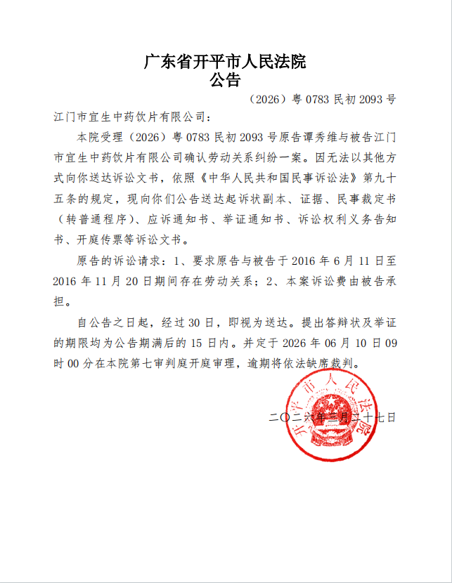 (2026)粤0783民初2093号 江门市宜生中药饮片有限公司 应诉公告.pdf