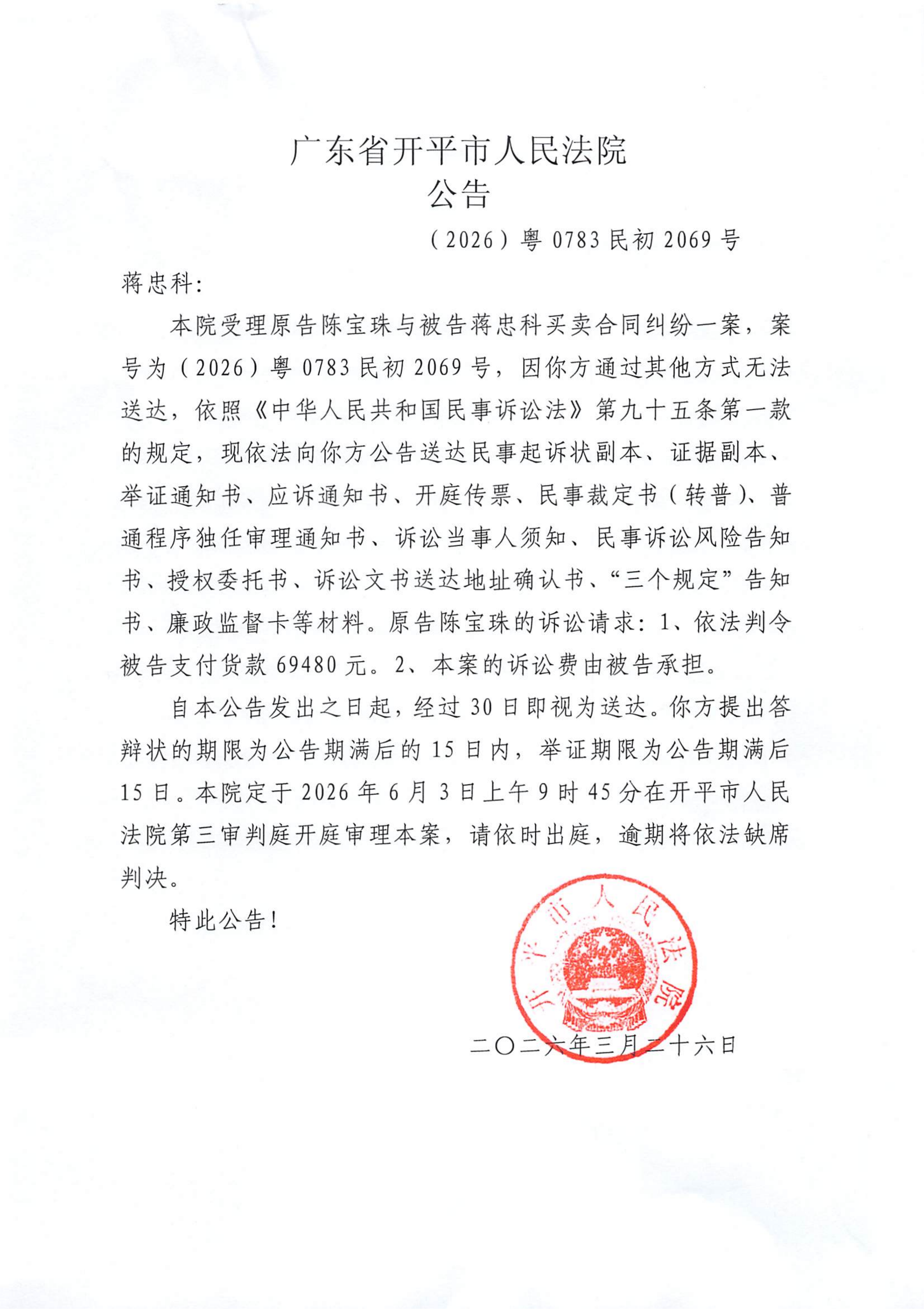 附件:(2026)粤0783民初2069号 蒋忠科 开庭公告.pdf