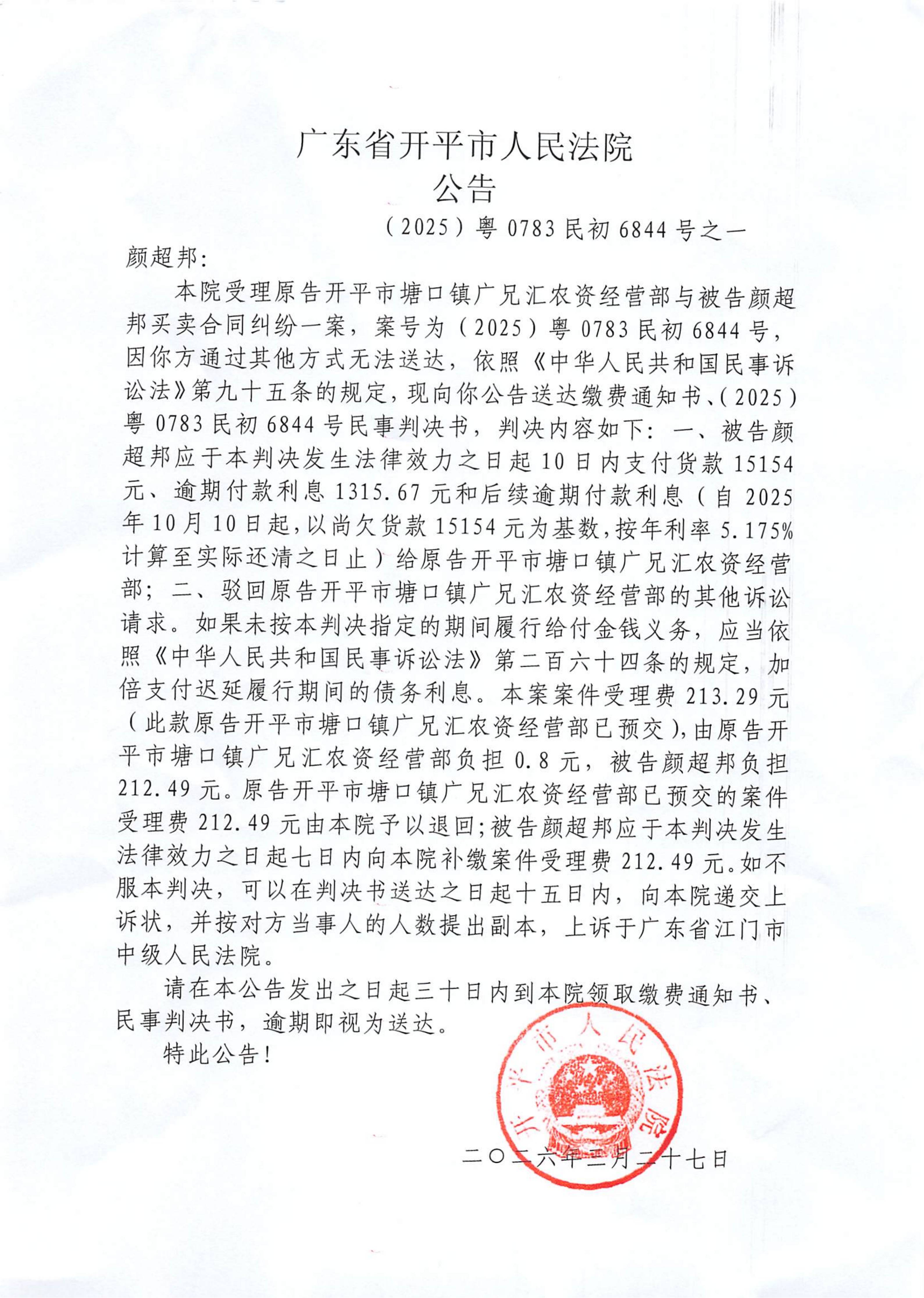 附件:(2025)粤0783民初6844号之一 颜超邦 判决公告.pdf