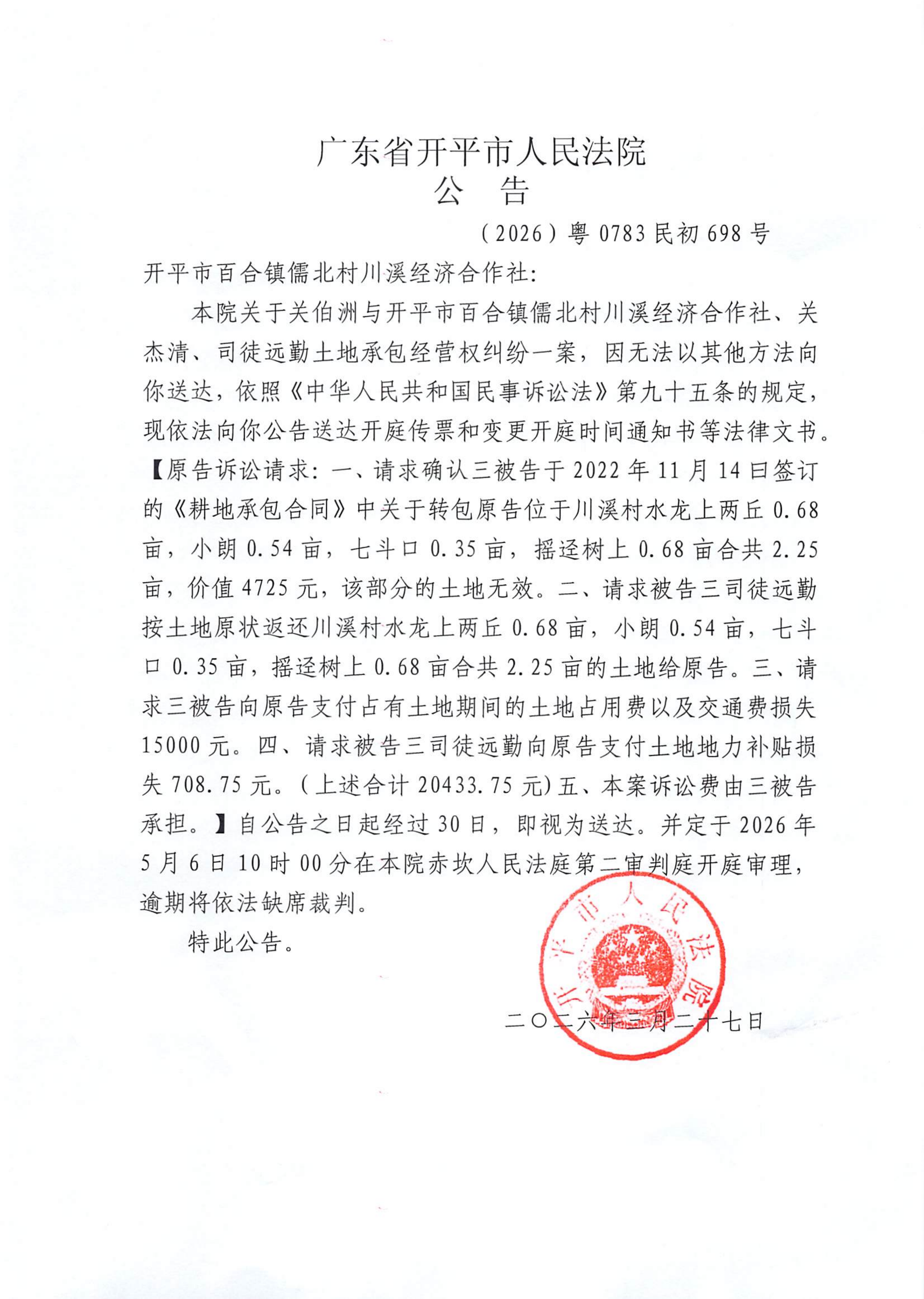 附件:(2026)粤0783民初698号 开平市百合镇儒北村川溪经济合作社 开庭公告.pdf