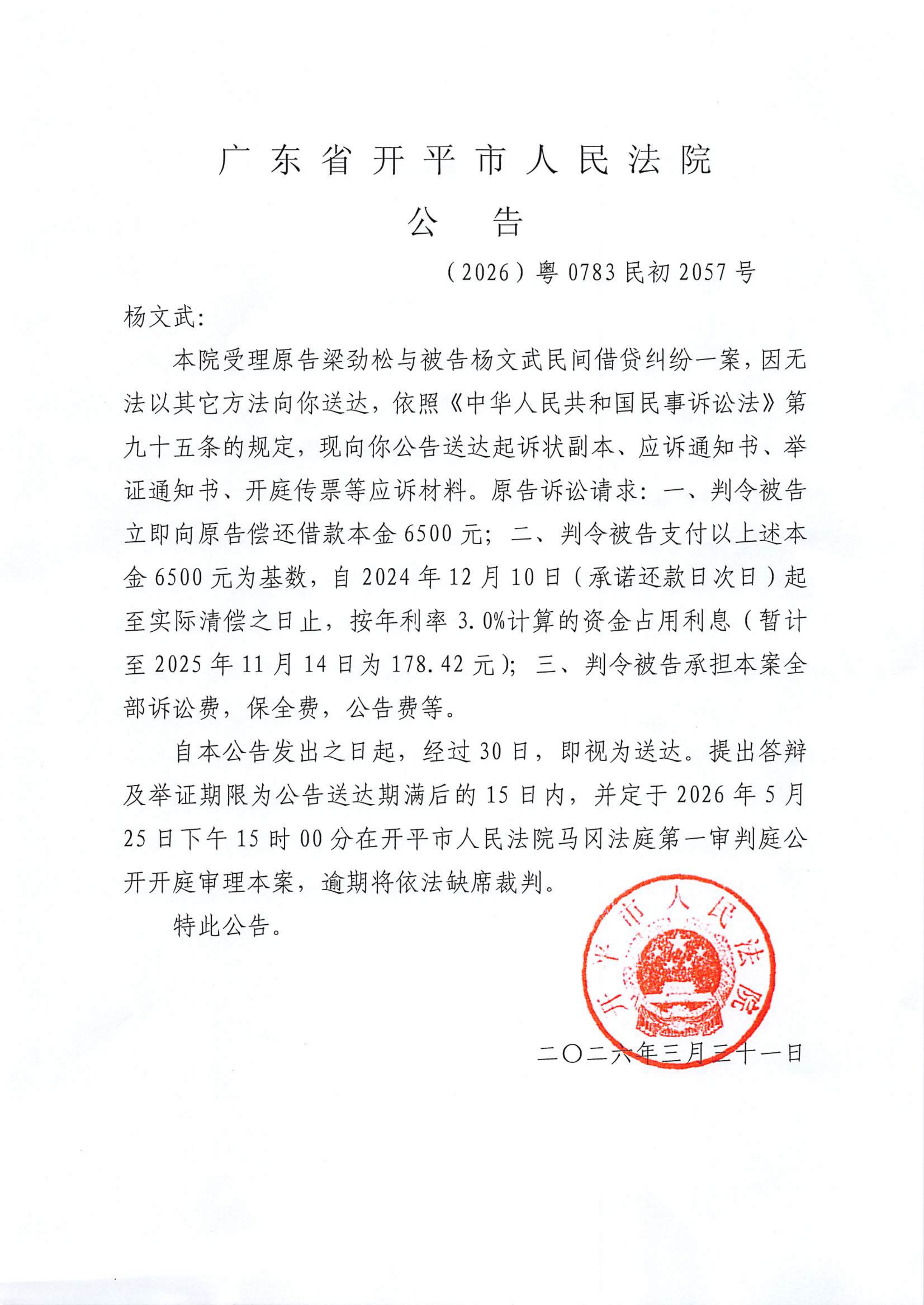 附件:(2026)粤0783民初2057号 杨文武 开庭公告.pdf