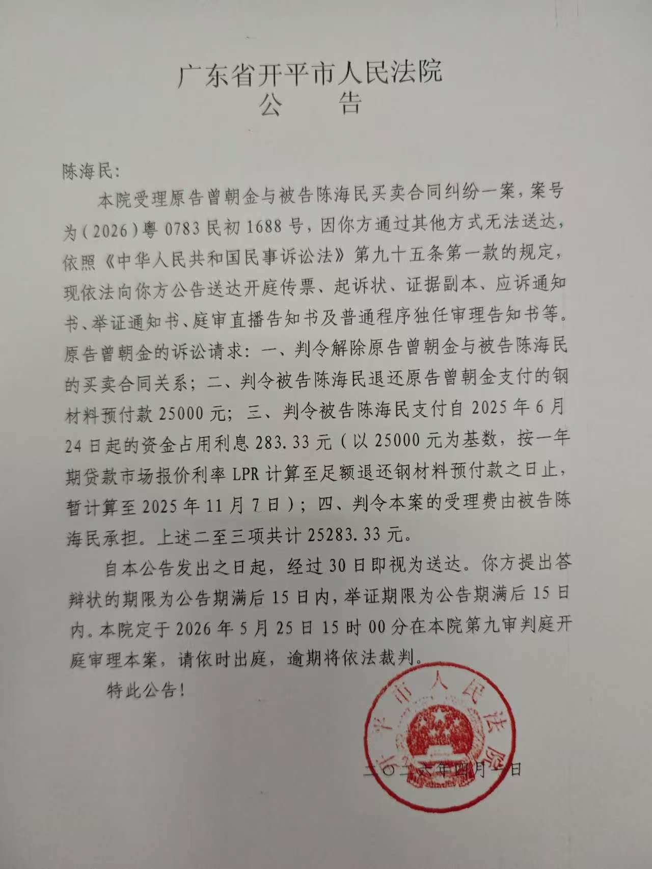(2026)粤0783民初1688号 陈海民 开庭公告