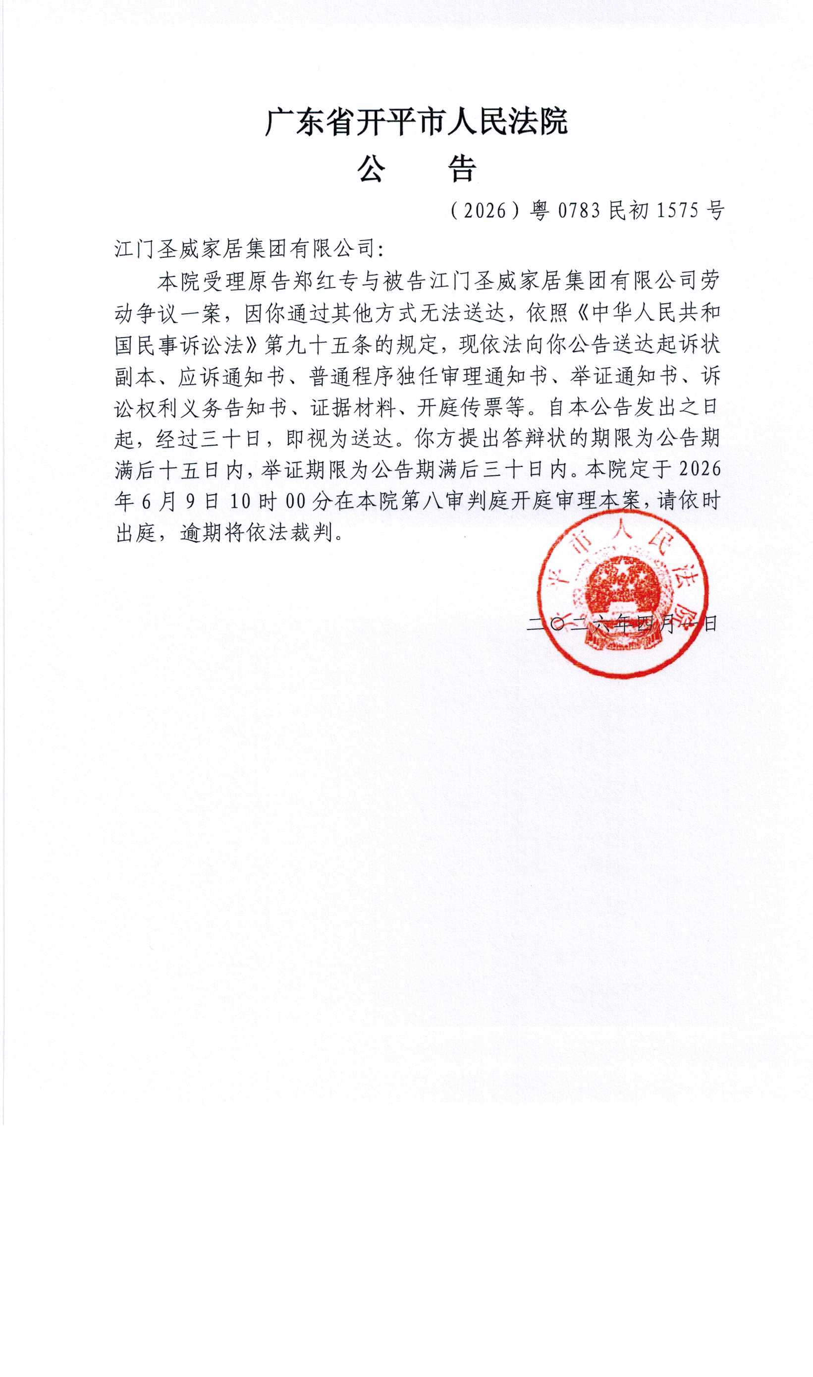 (2026)粤0783民初1575号江门圣威家居集团有限公司传票公告