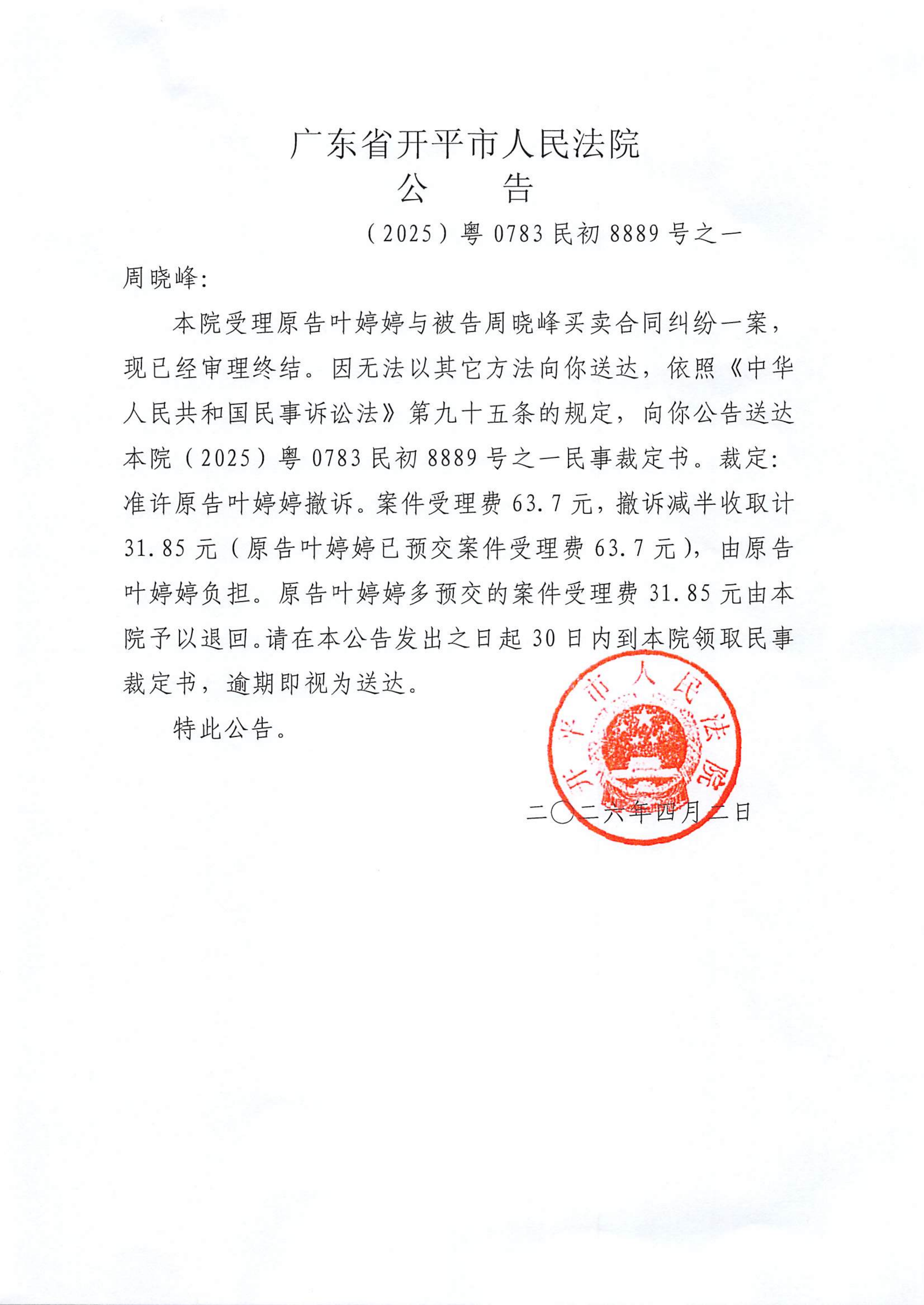 附件:(2025)粤0783民初8889号之一 周晓峰 裁定公告.pdf