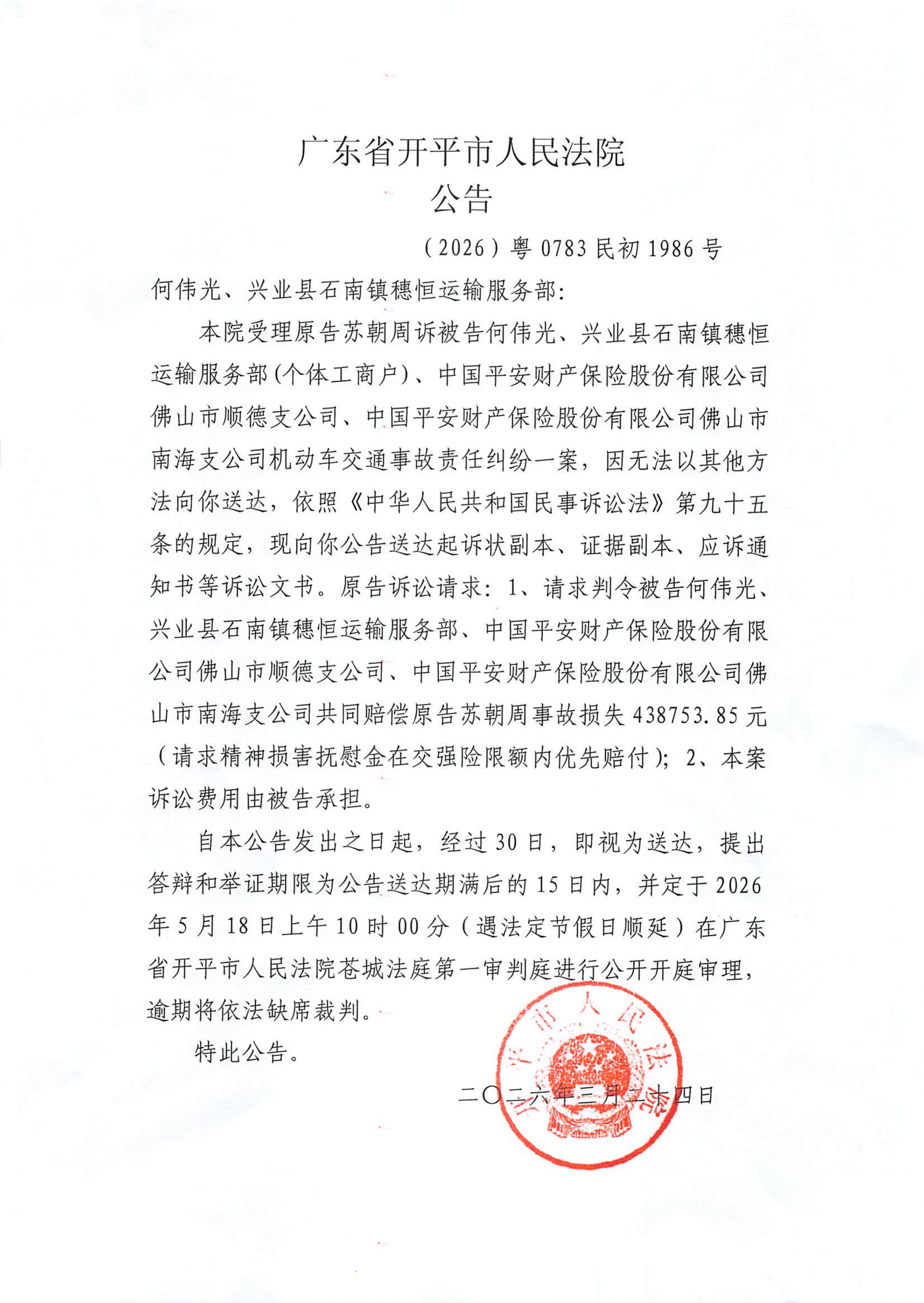 附件:(2026)粤0783民初1986号 何伟光、兴业县石南镇穗恒运输服务部 开庭公告.pdf