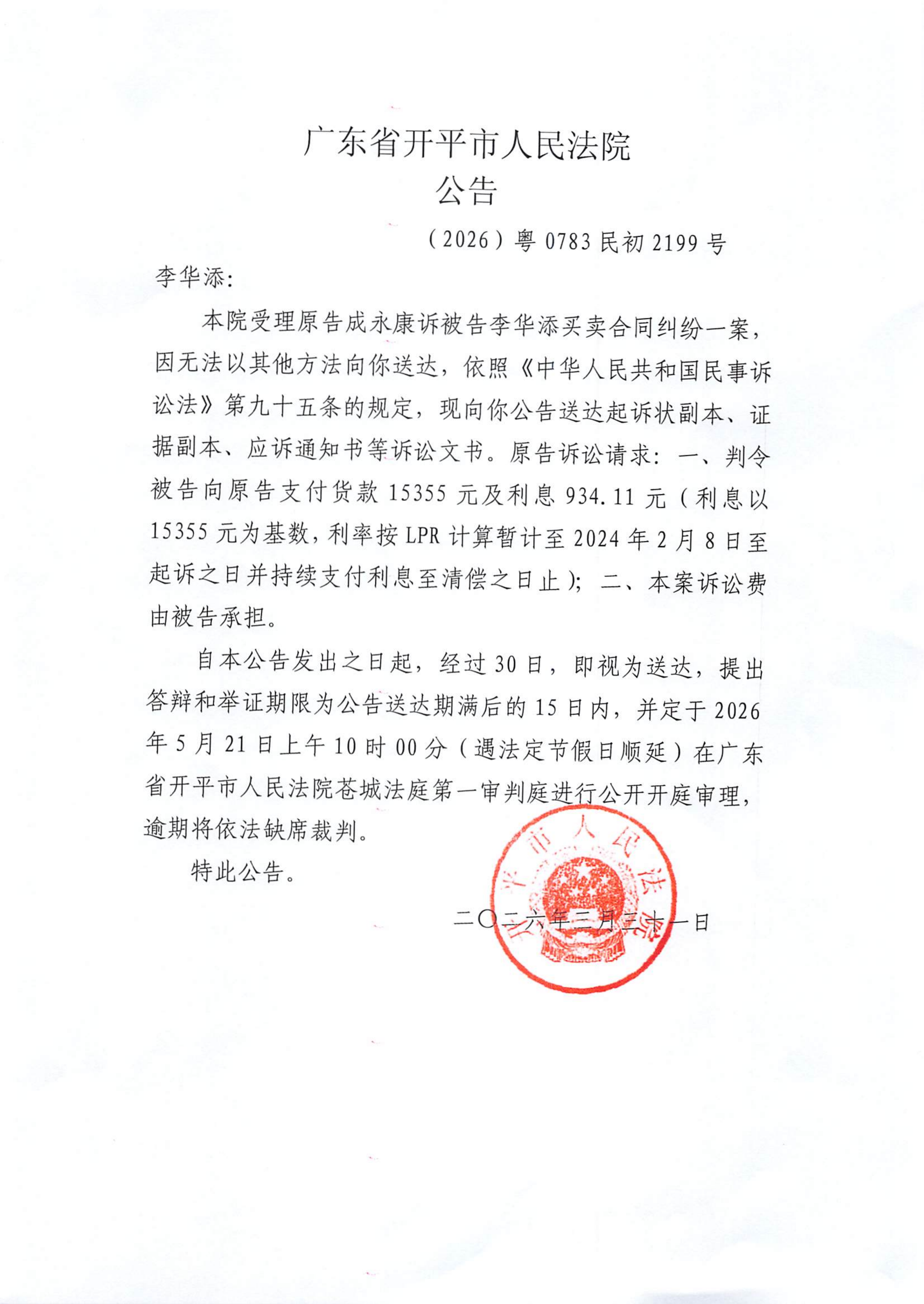 附件:(2026)粤0783民初2199号 李华添 开庭公告.pdf