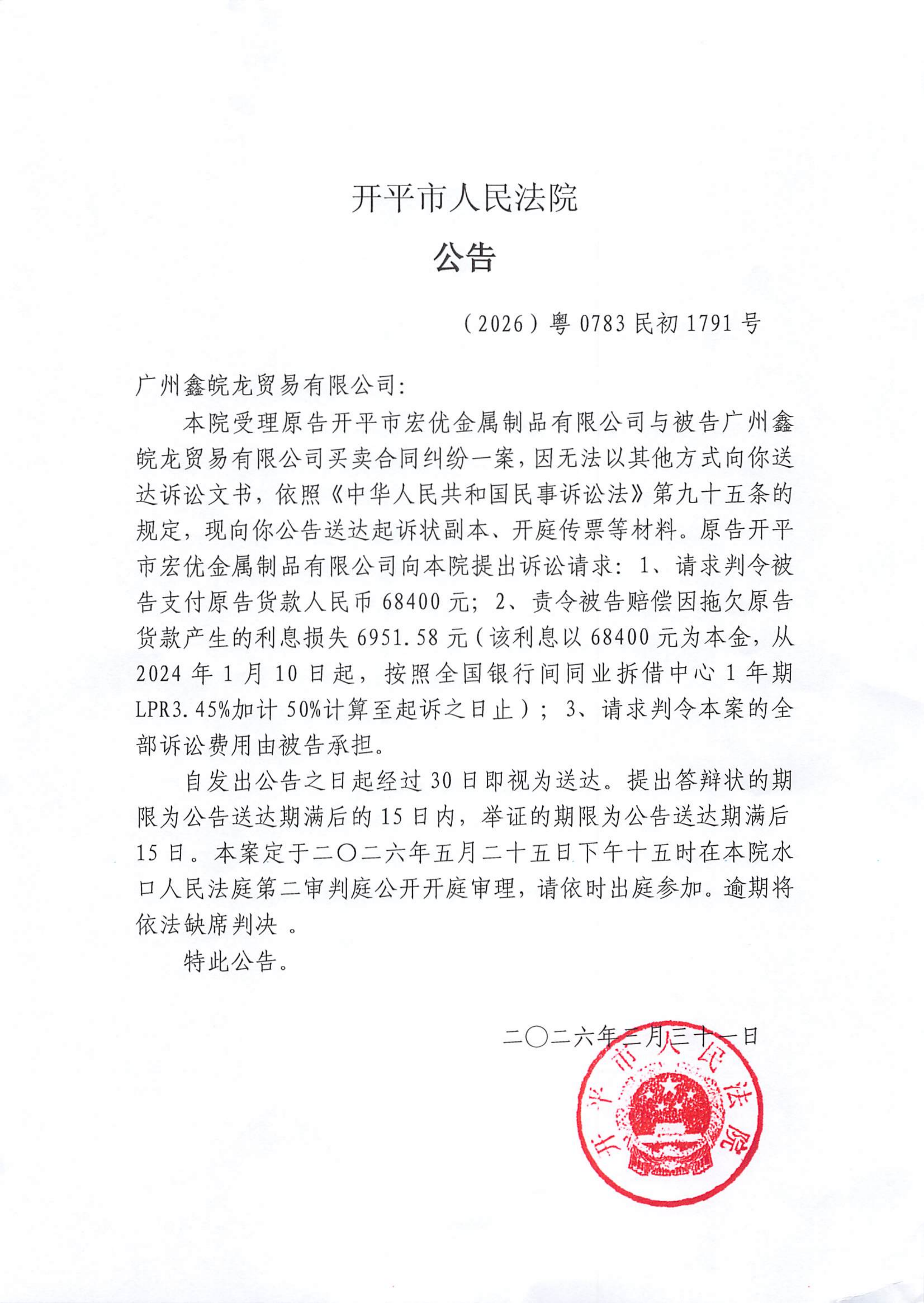 附件:(2026)粤0783民初1791号 广州鑫皖龙贸易有限公司 开庭公告.pdf