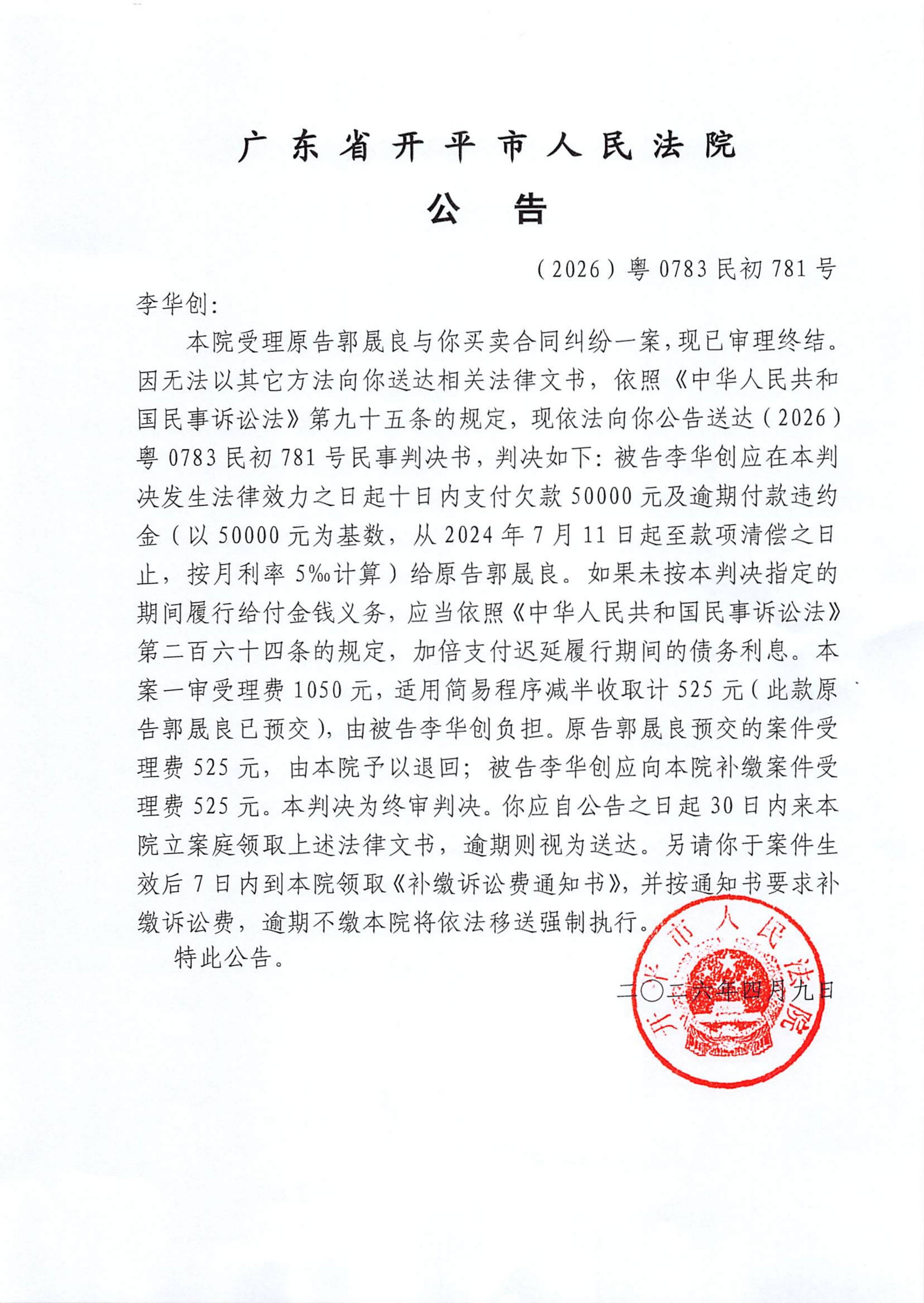 附件:(2026)粤0783民初781号 李华创 判决公告.pdf