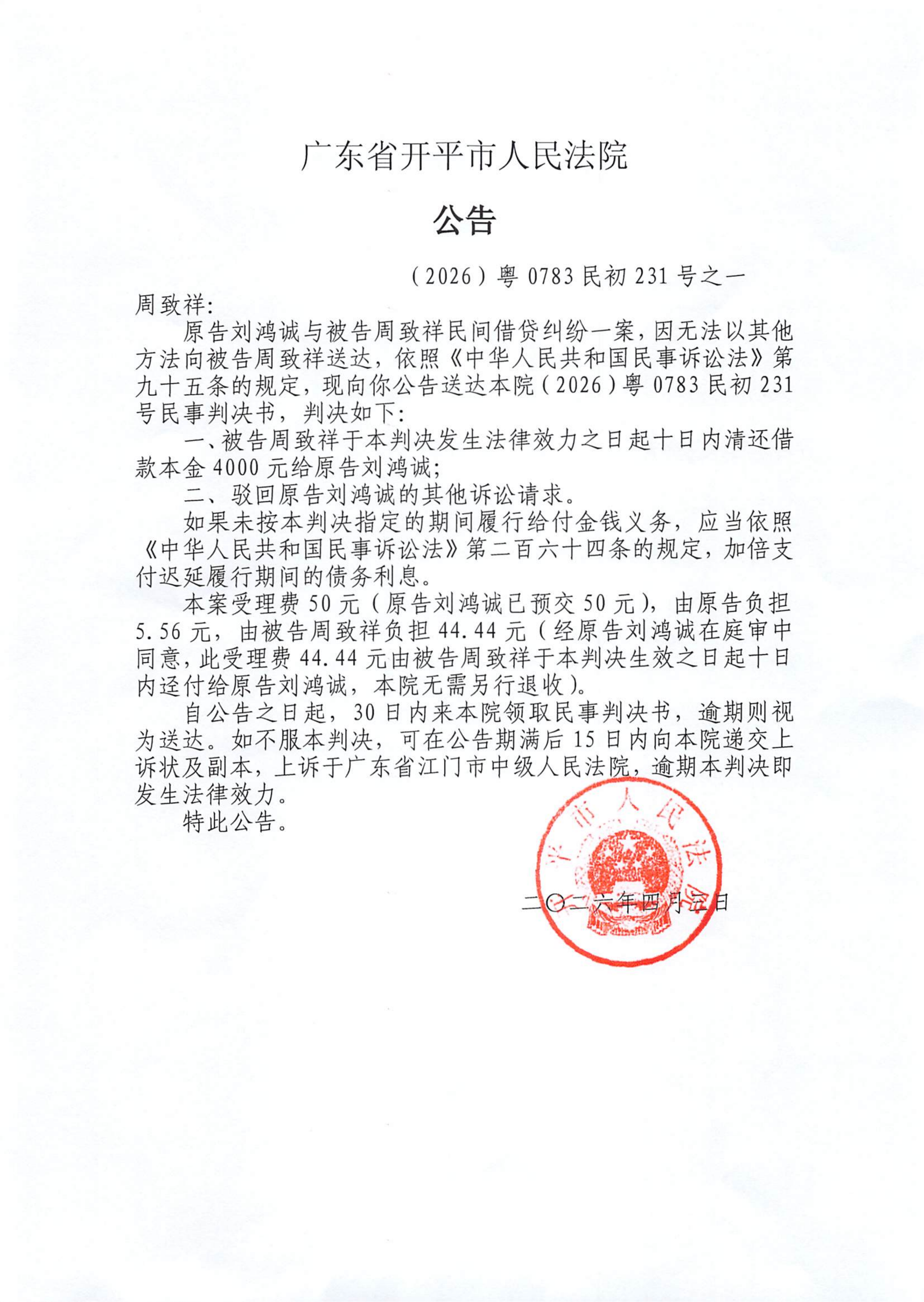 附件:(2026)粤0783民初231号之一 周致祥 判决公告.pdf