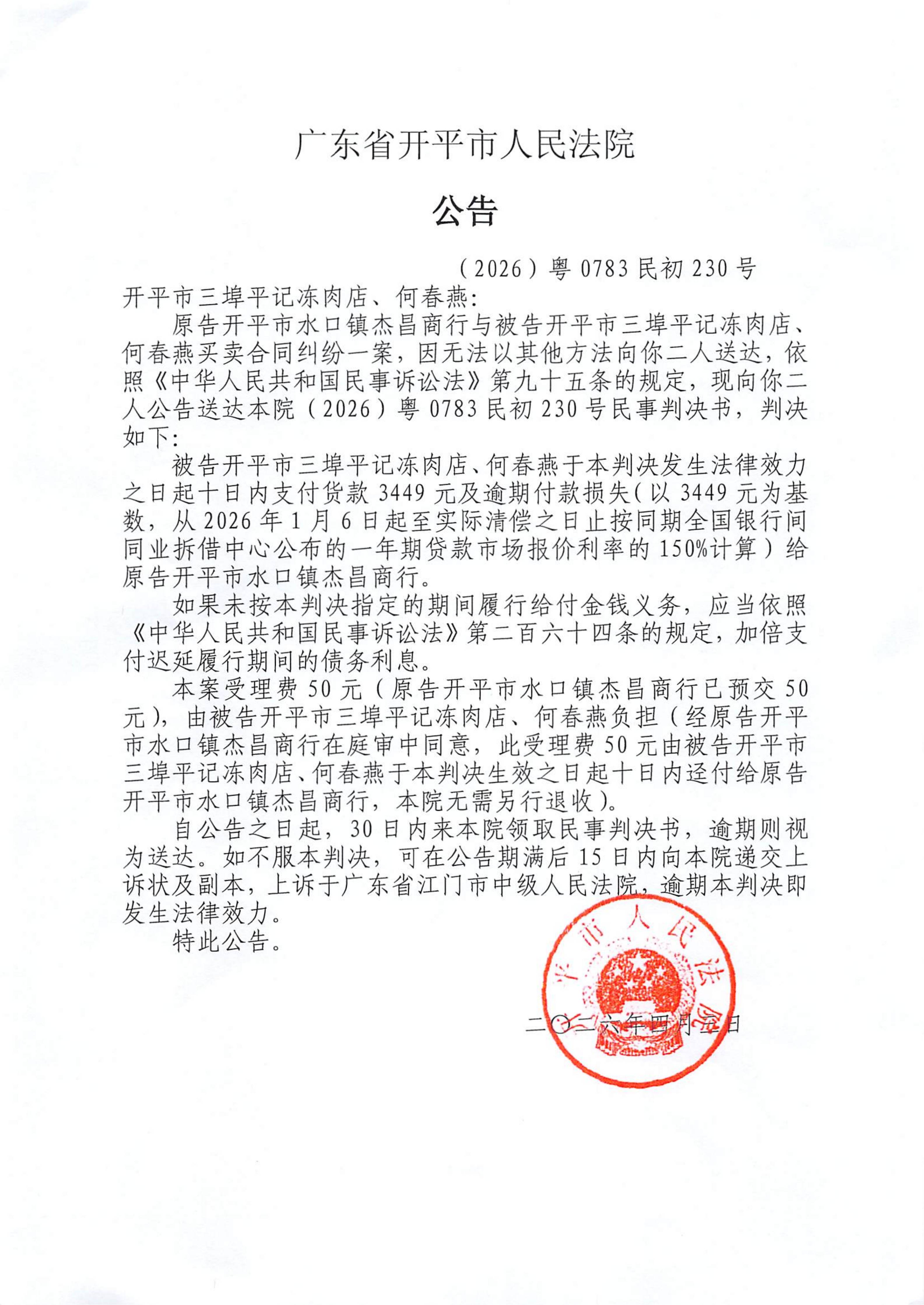 附件:(2026)粤0783民初230号 开平市三埠平记冻肉店、何春燕 判决公告.pdf