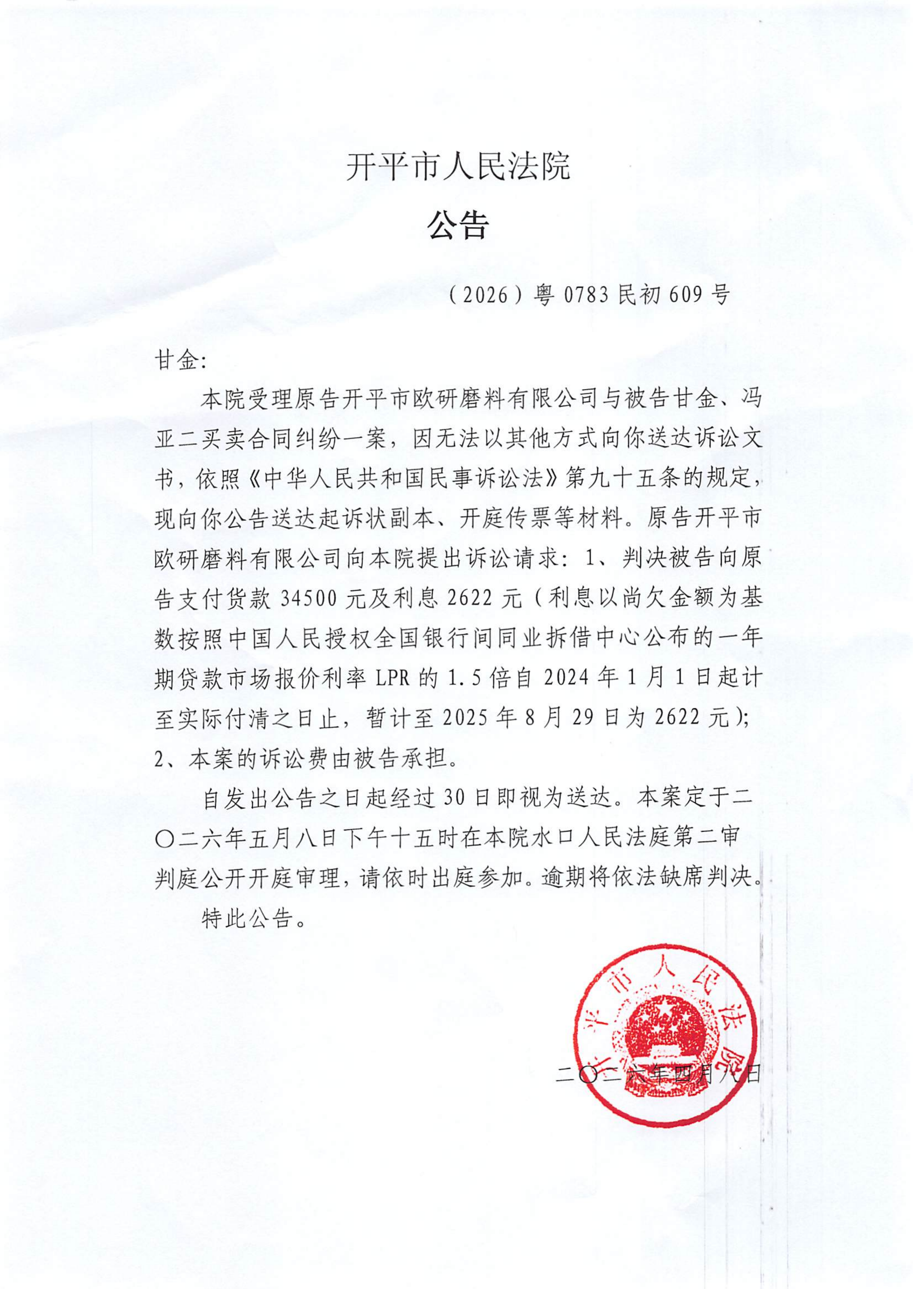附件:(2026)粤0783民初609号 甘金 开庭公告.pdf