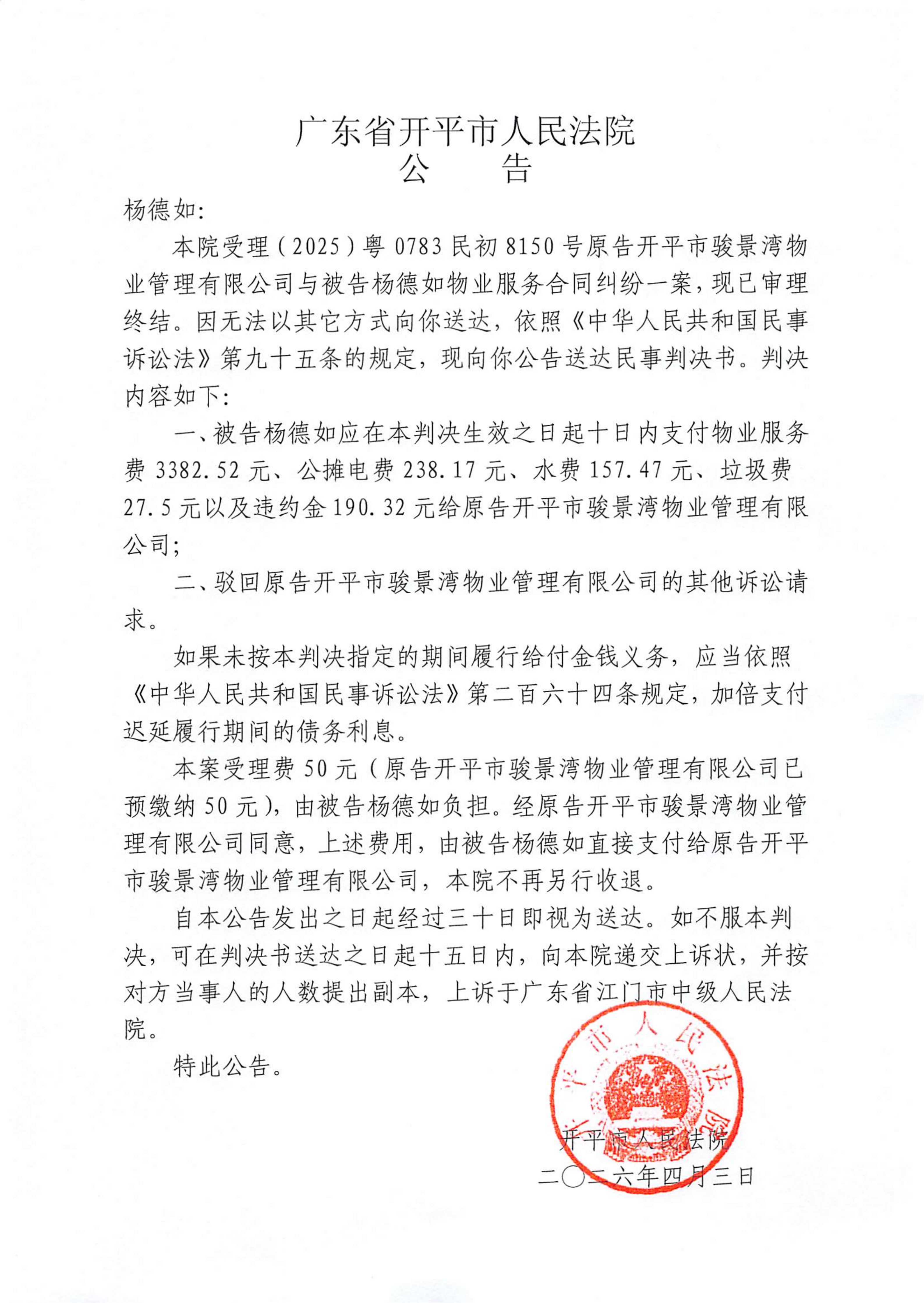附件:(2025)粤0783民初8150号 杨德如 判决公告.pdf