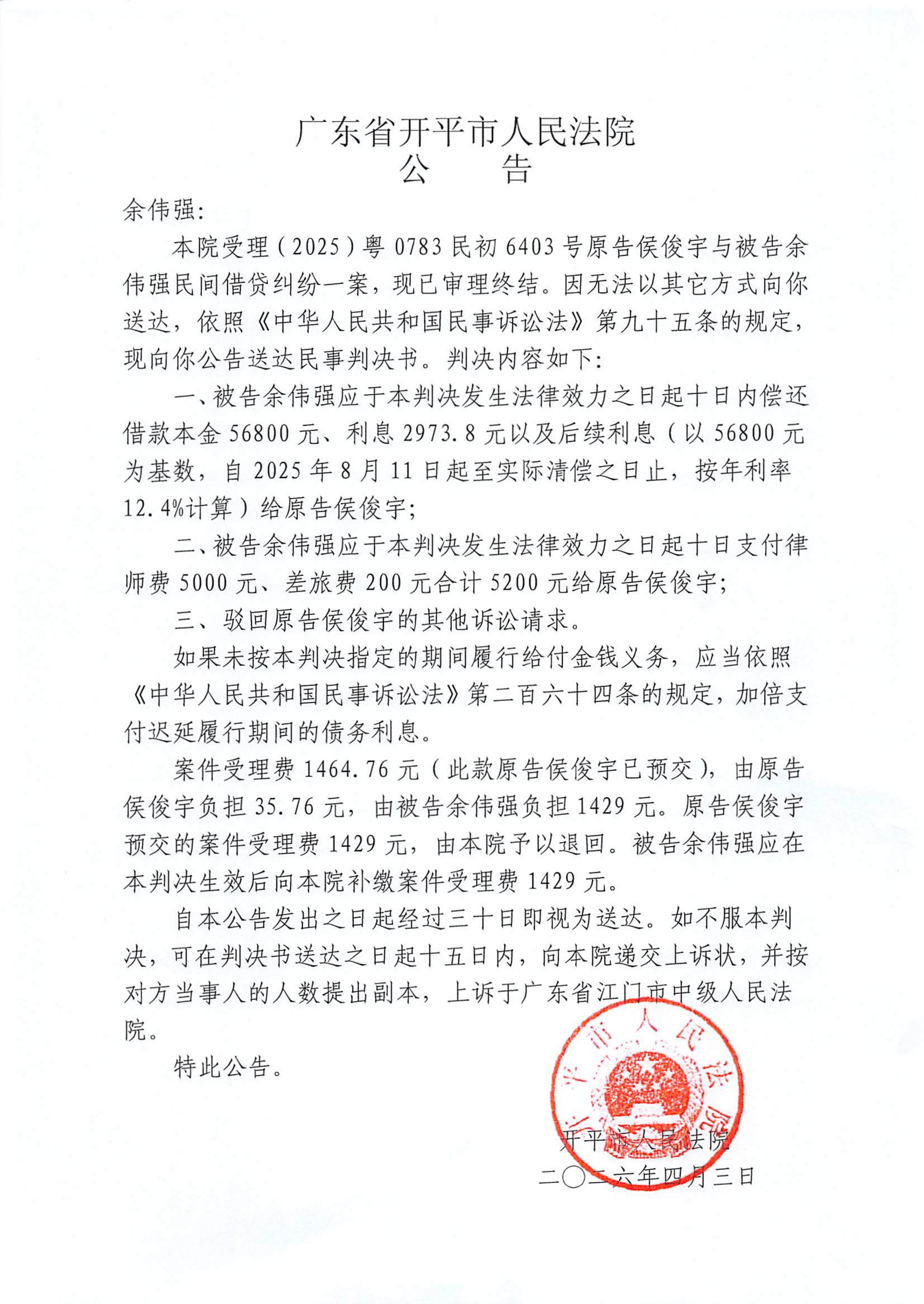 附件:(2025)粤0783民初6403号 余伟强 判决公告.pdf