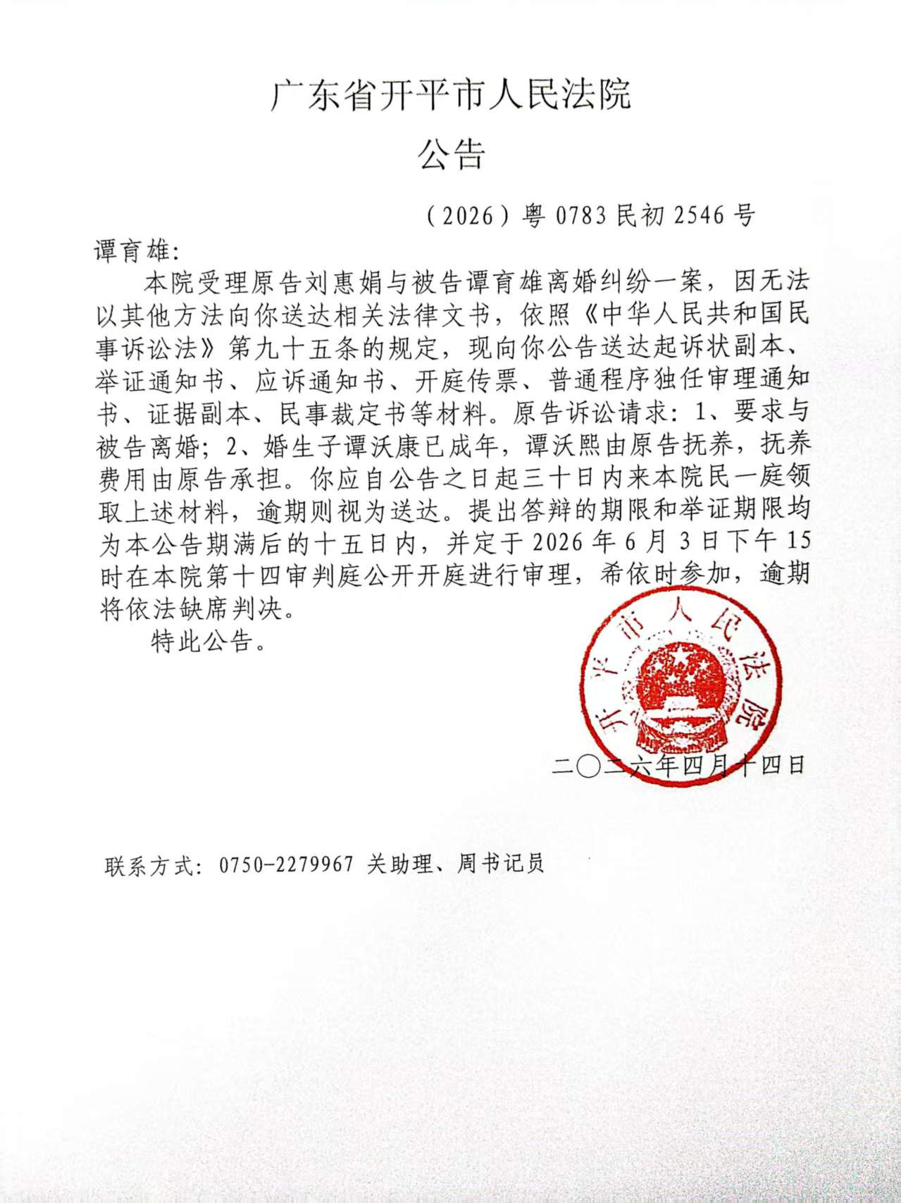(2026)粤0783民初2546号谭育雄应诉公告.pdf