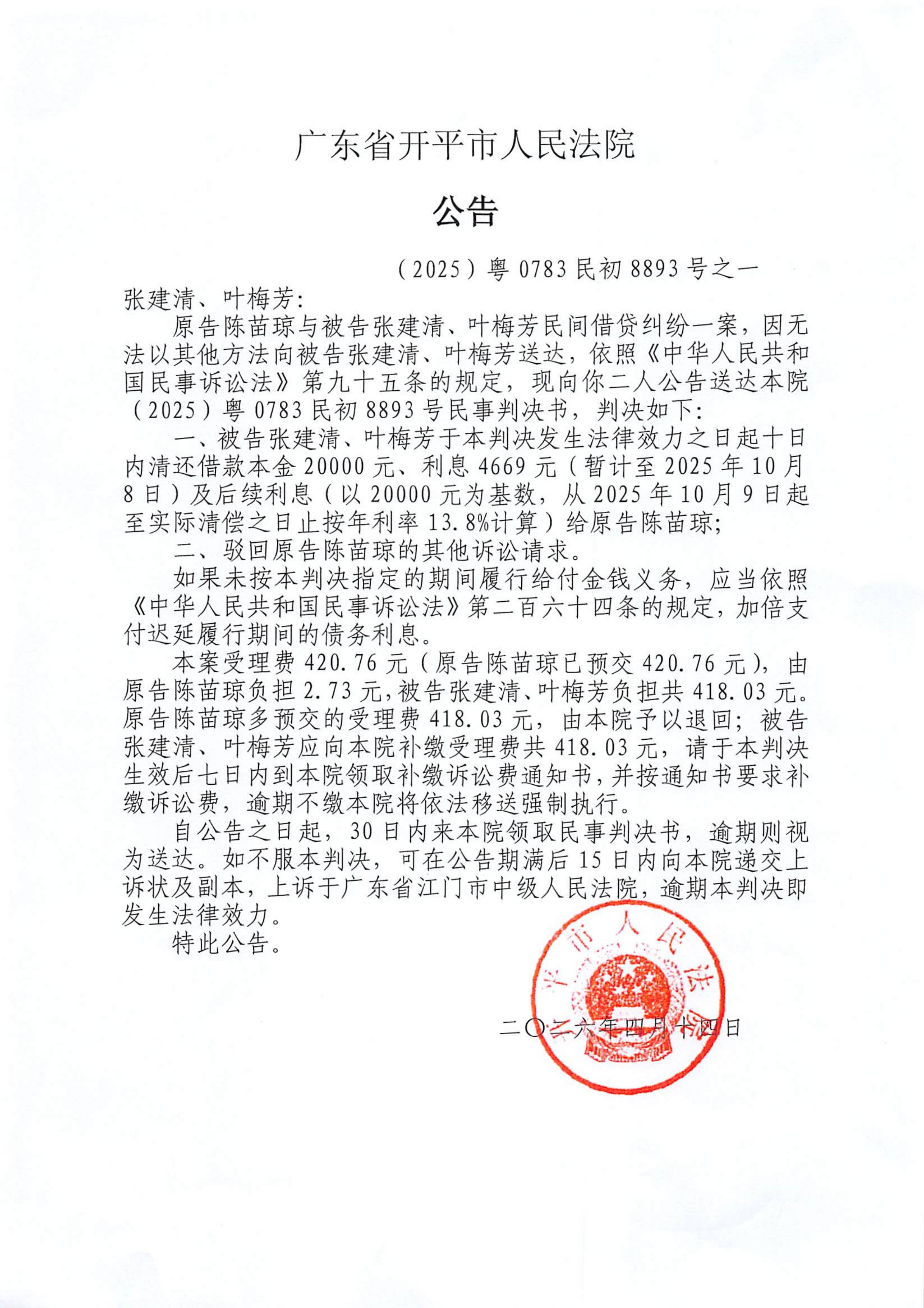 附件:(2025)粤0783民初8893号之一 张建清、叶梅芳 判决公告.pdf
