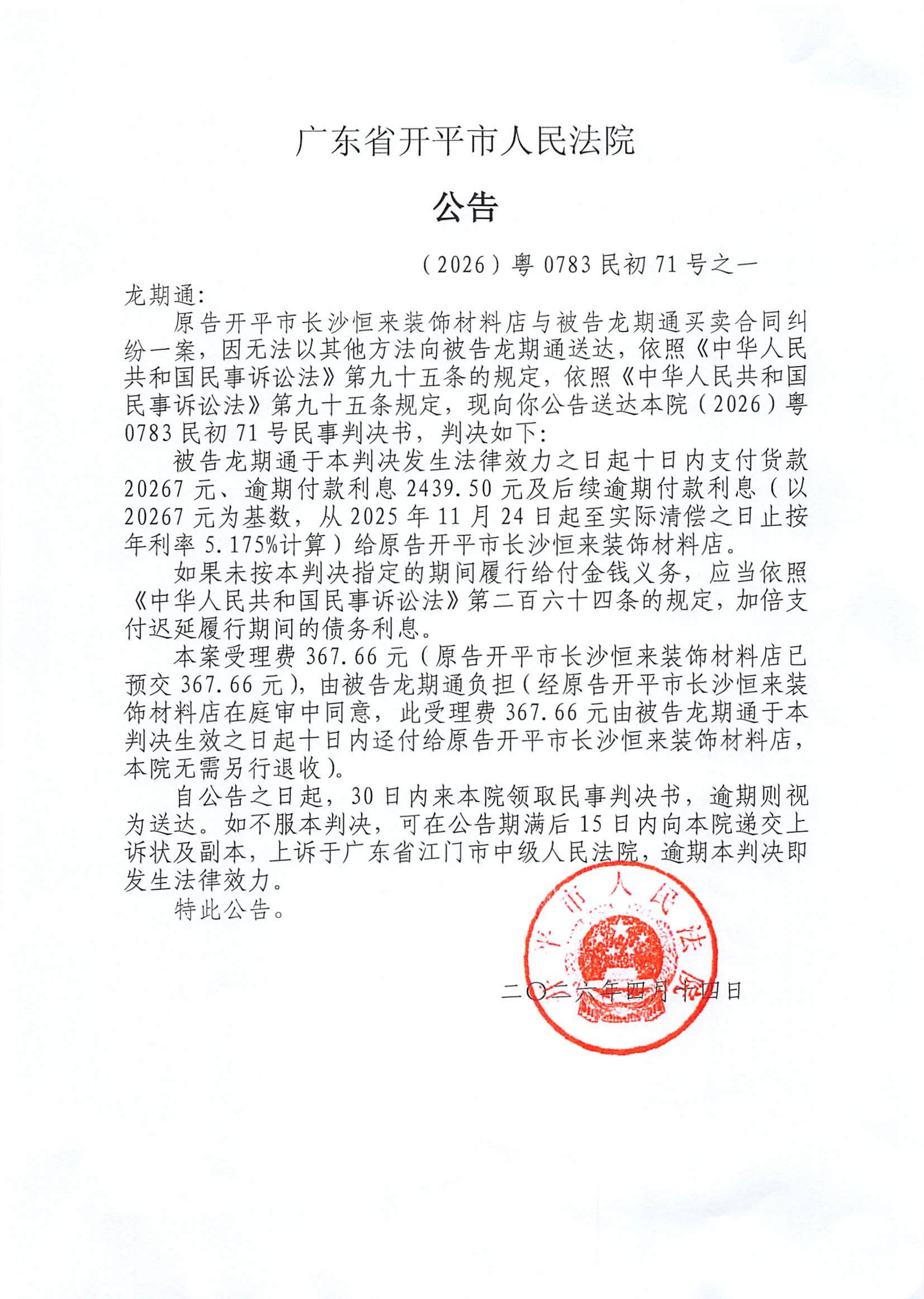 附件:(2026)粤0783民初71号之一 龙期通 判决公告.pdf