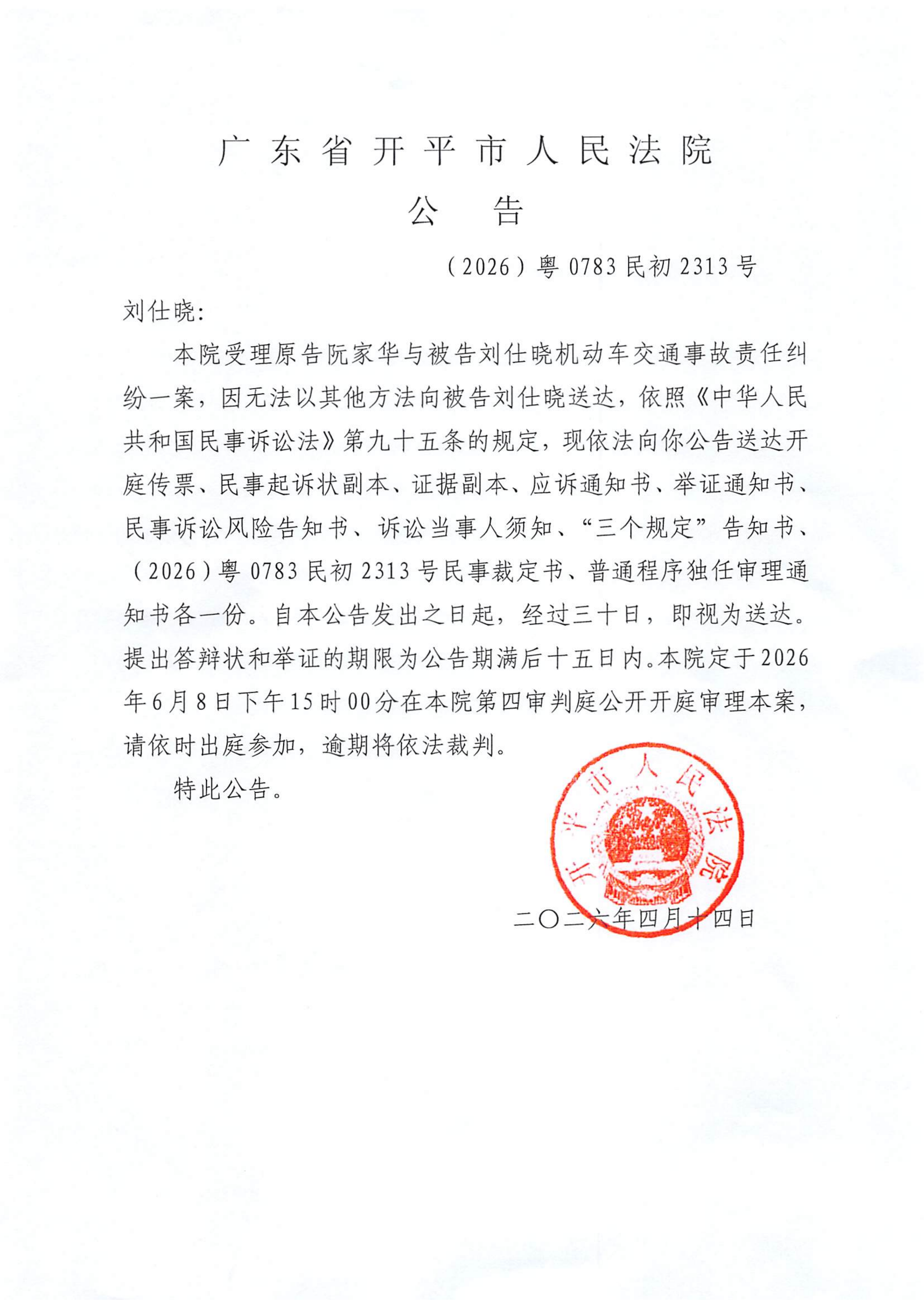 附件:(2026)粤0783民初2313号 刘仕晓 开庭公告.pdf