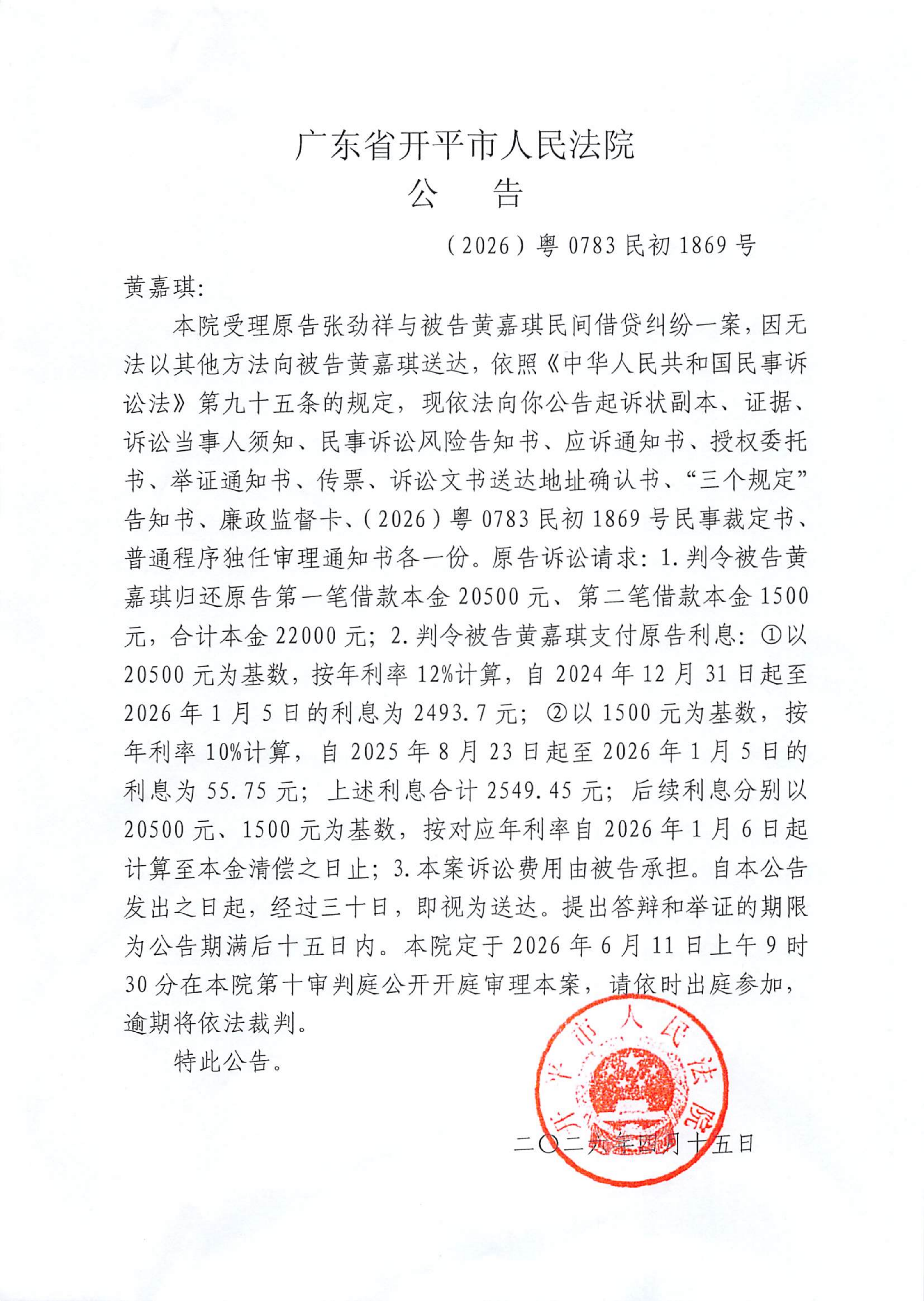 附件:(2026)粤0783民初1869号 黄嘉琪 开庭公告.pdf