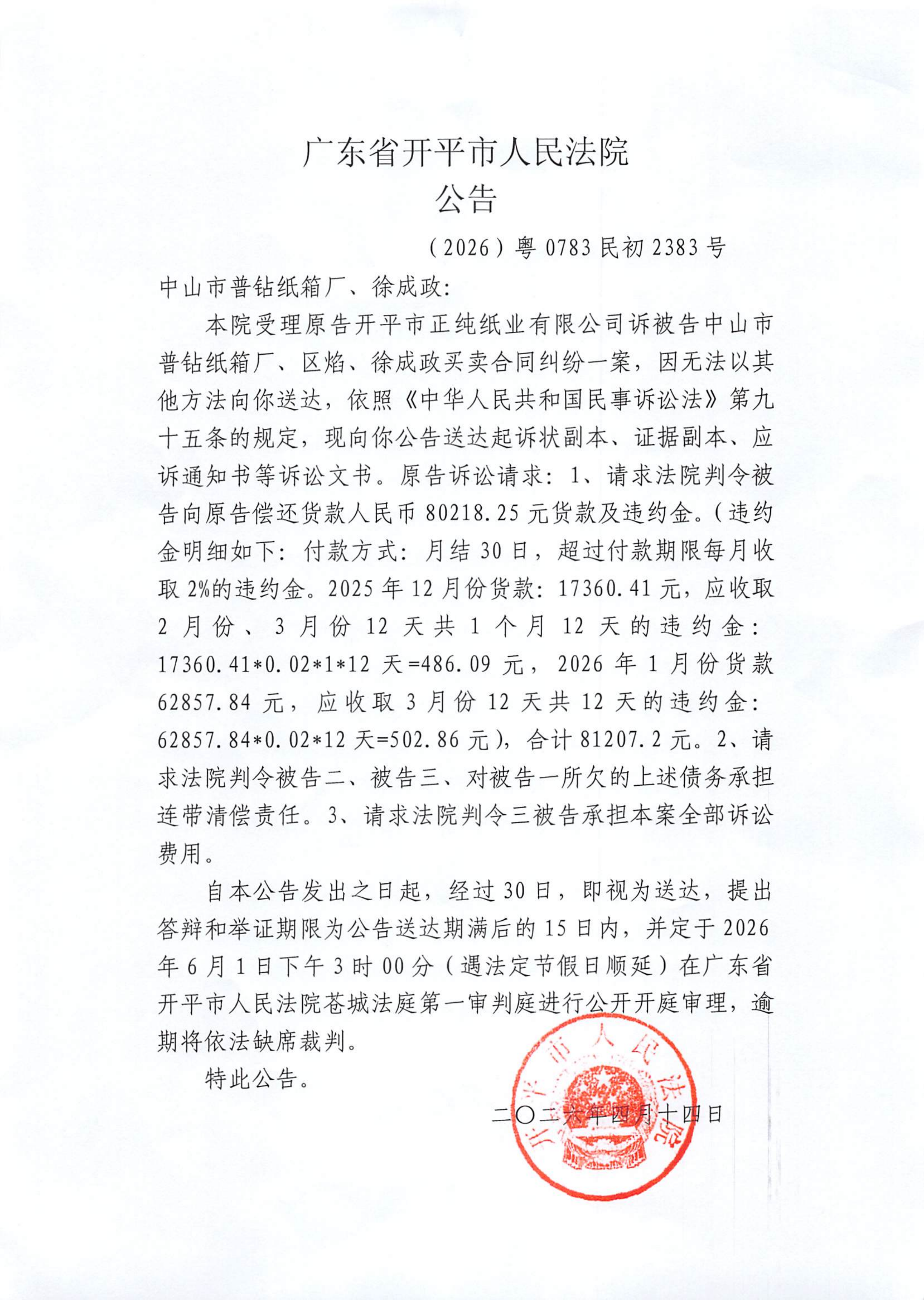 附件:(2026)粤0783民初2383号 中山市普钻纸箱厂、徐成政 开庭公告.pdf