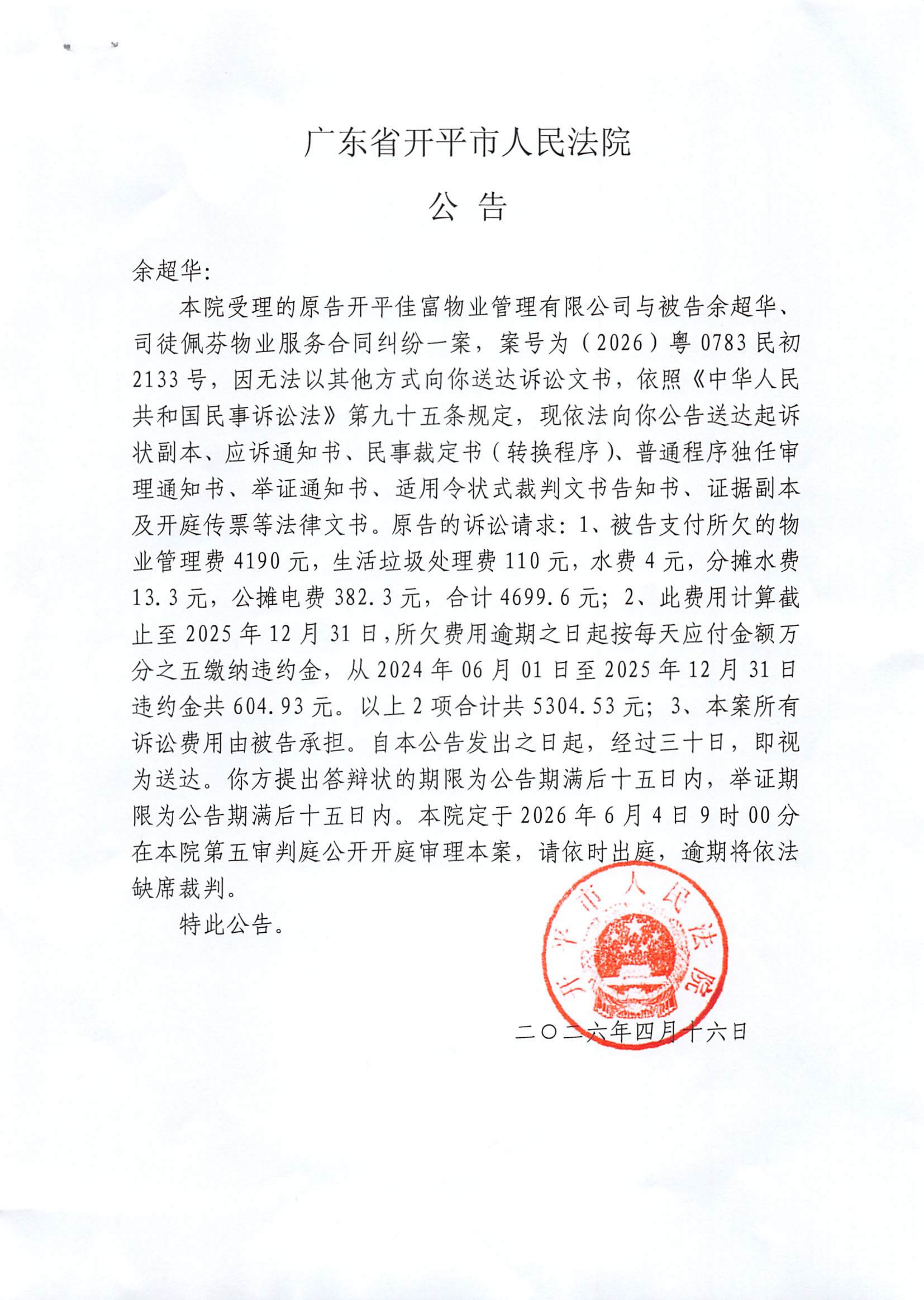 附件:(2026)粤0783民初2133号 余超华 开庭公告.pdf