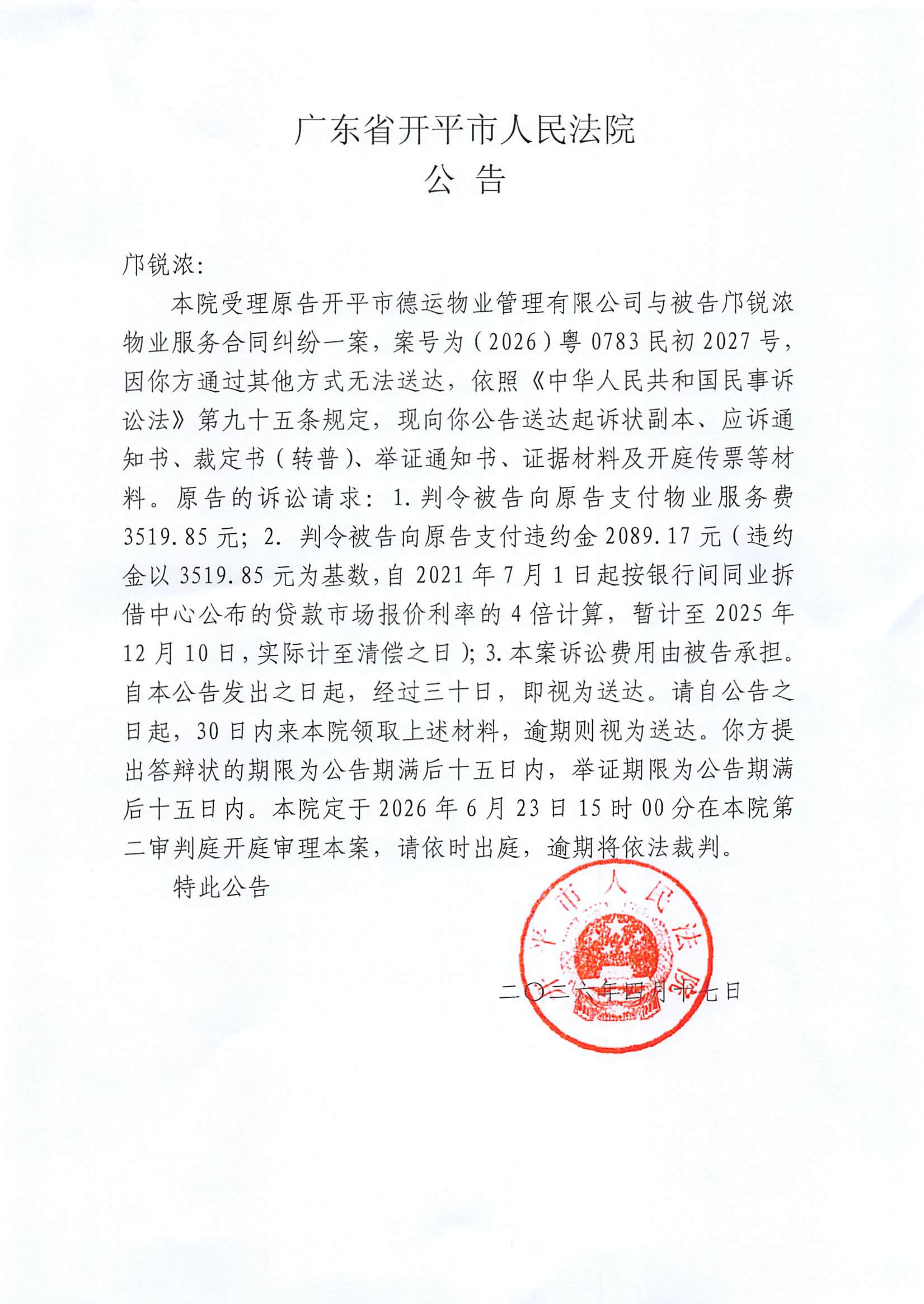 附件:(2026)粤0783民初2027号 邝锐浓 开庭公告.pdf
