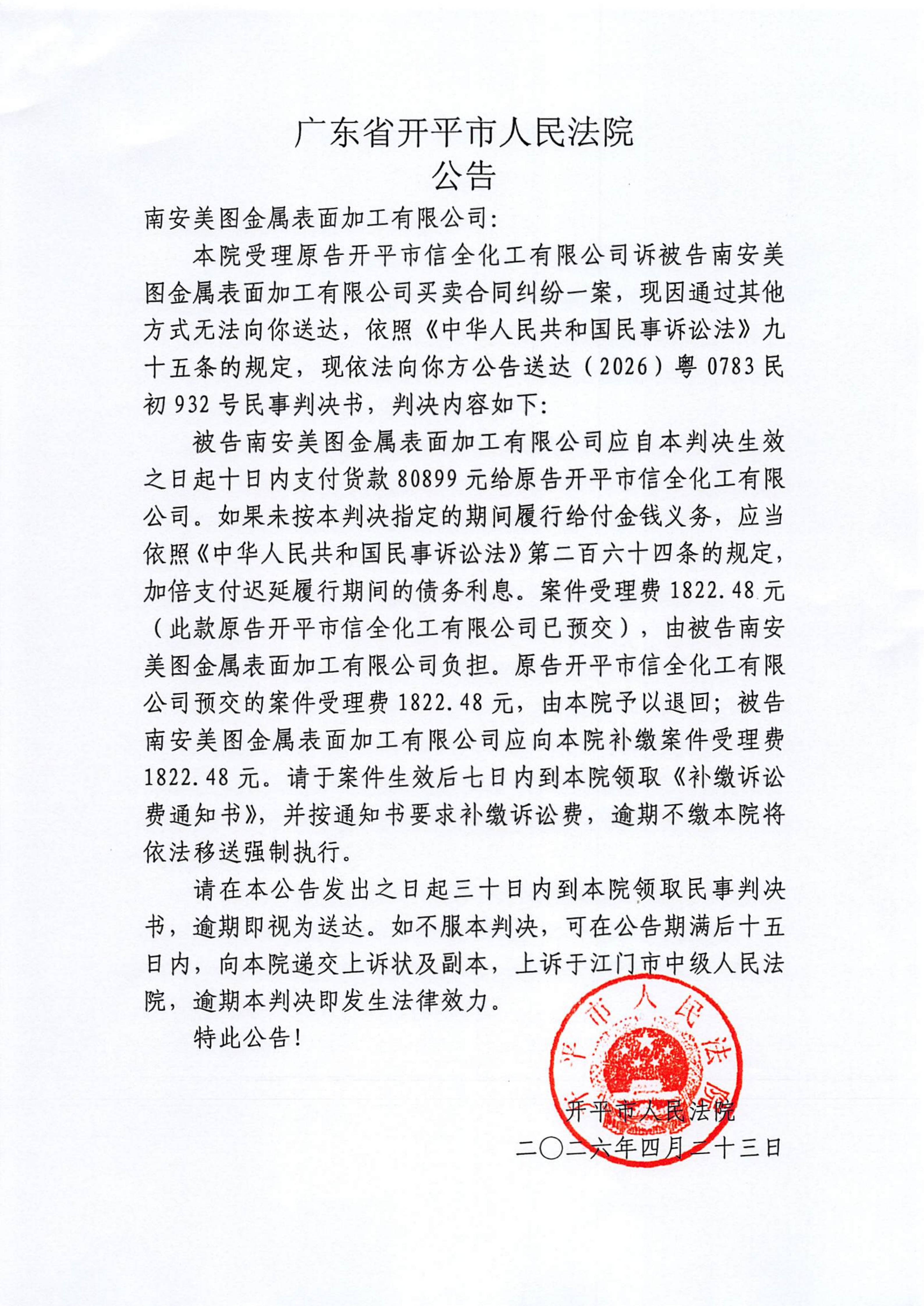 附件:(2026)粤0783民初932号 南安美图金属表面加工有限公司 判决公告.pdf