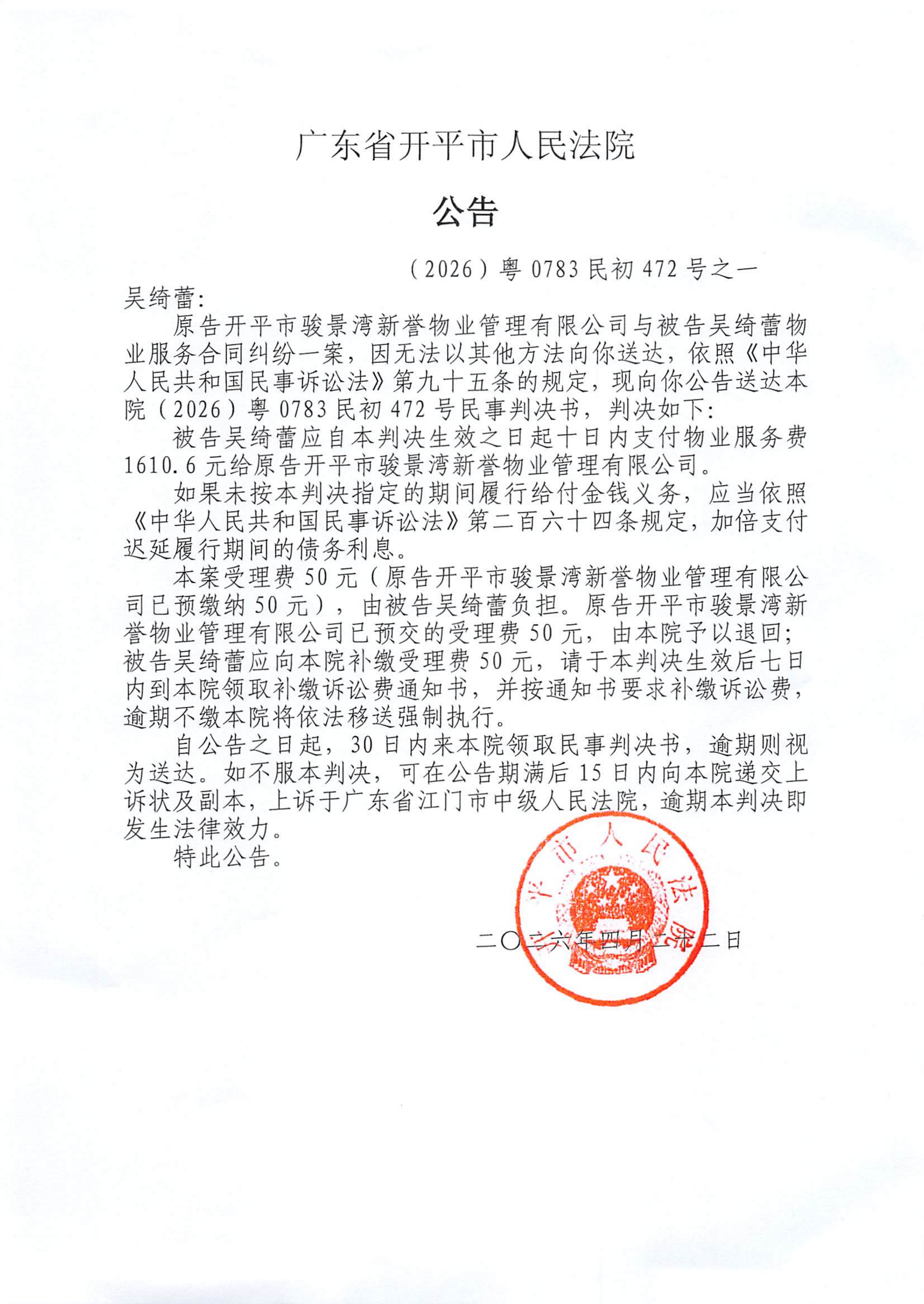 附件:(2026)粤0783民初472号之一 吴绮蕾 判决公告.pdf