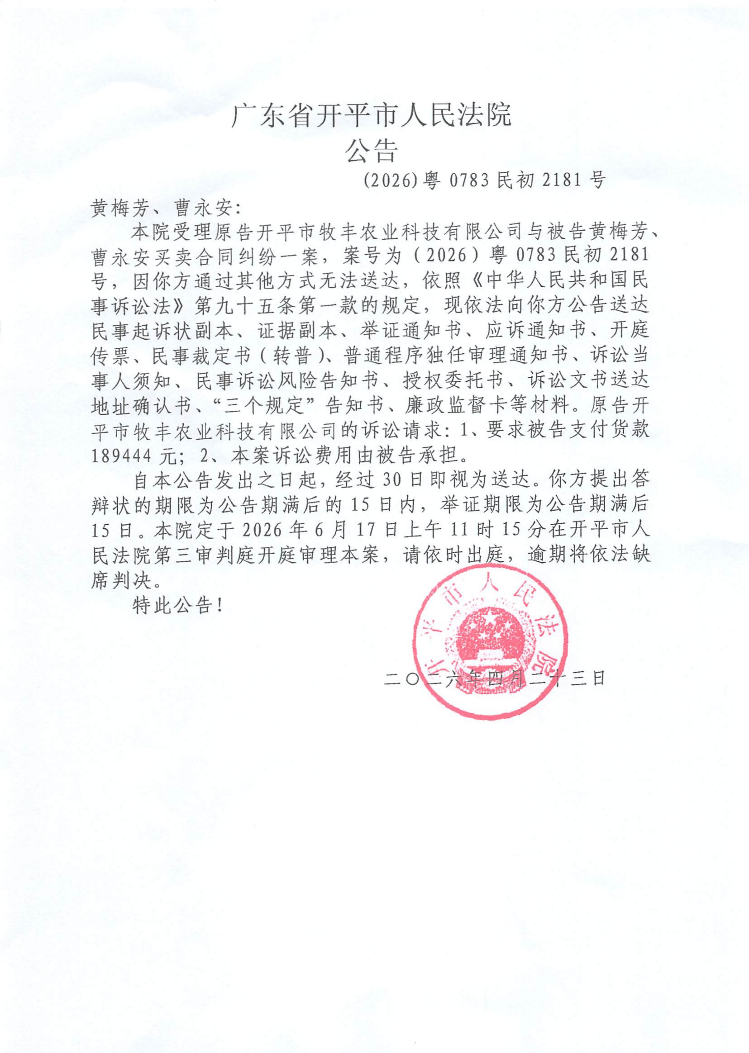 附件::(2026)粤0783民初2181号 黄梅芳、曹永安 开庭公告.pdf