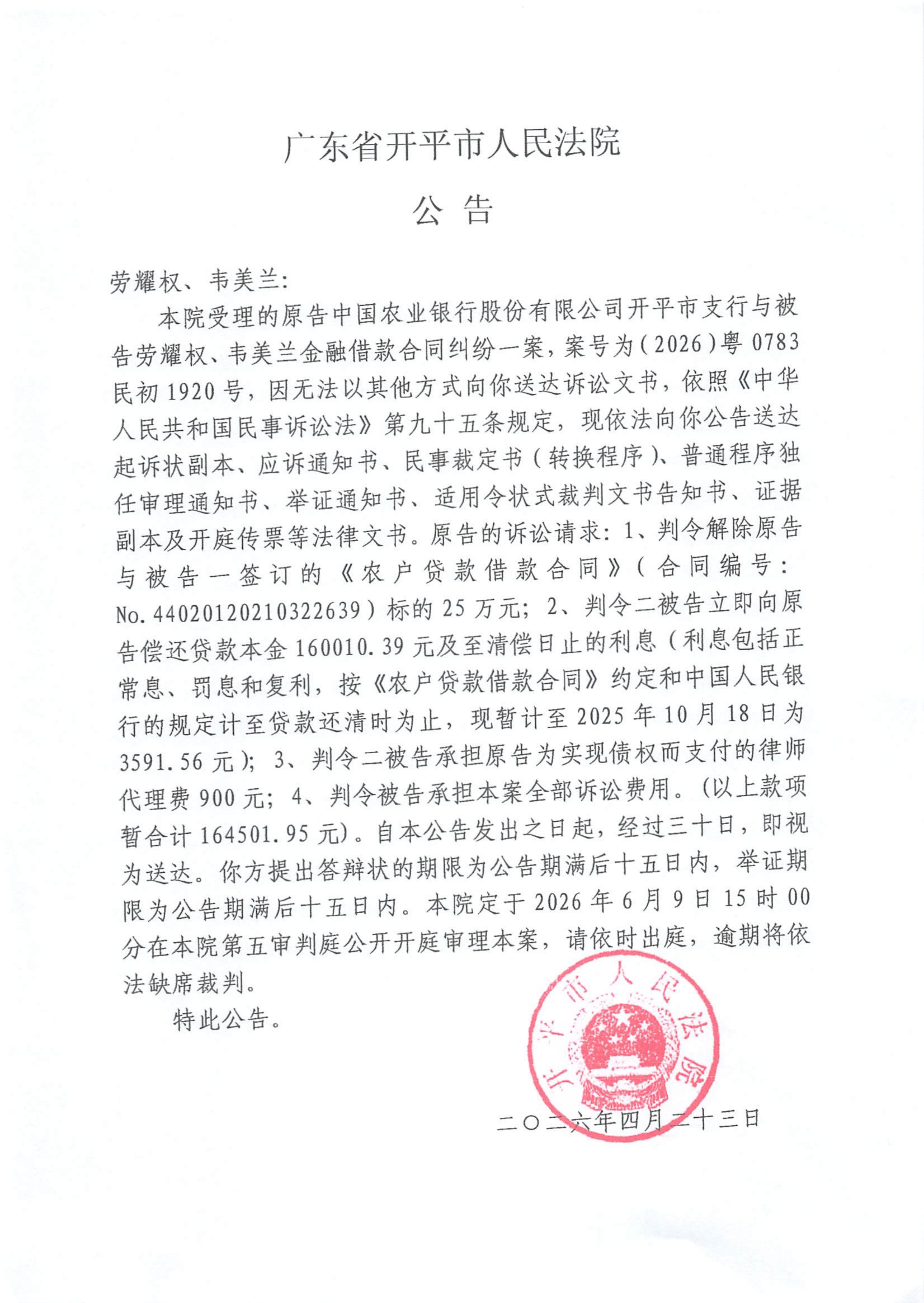 附件:(2026)粤0783民初1920号 劳耀权、韦美兰 开庭公告.pdf