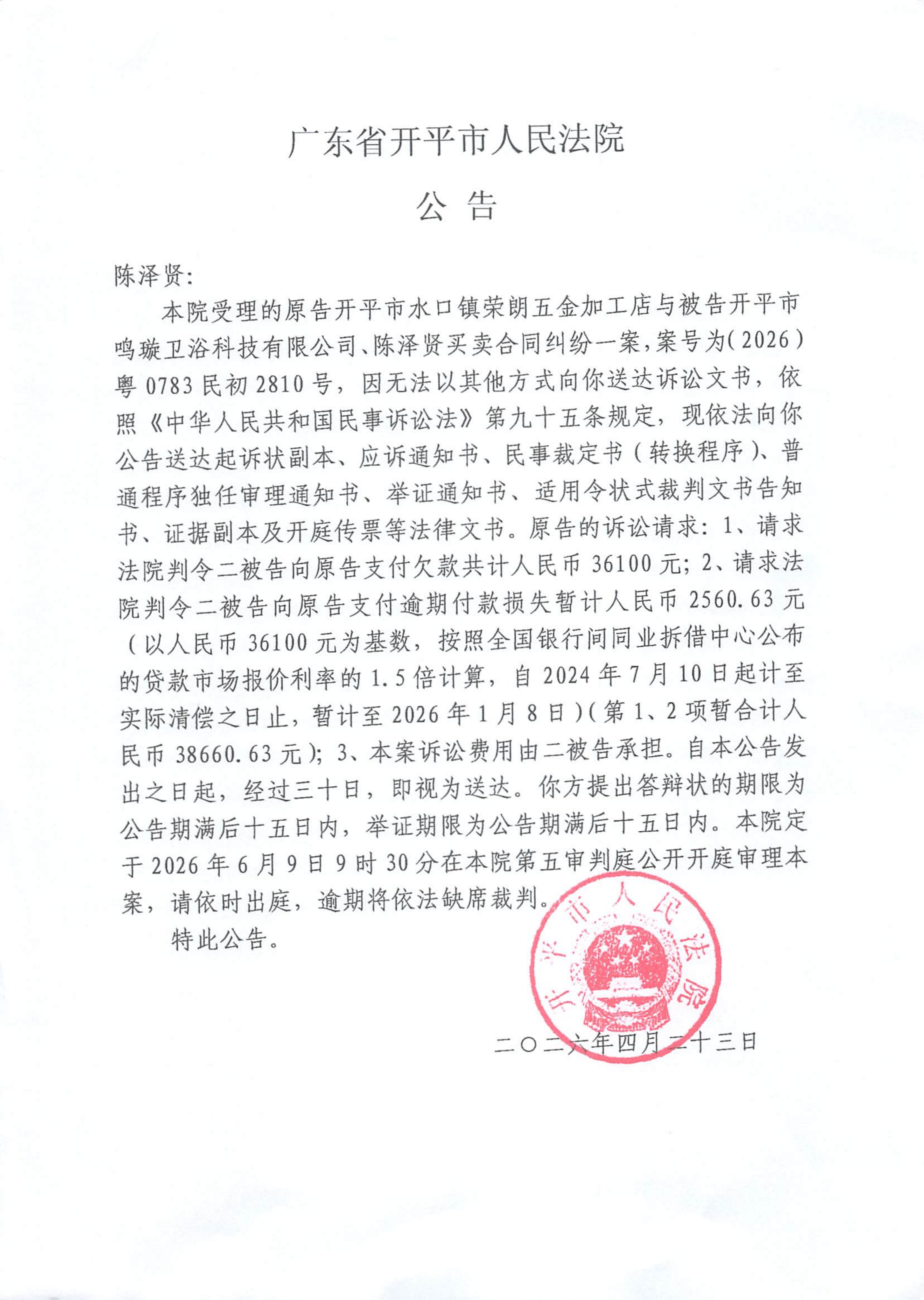 附件:(2026)粤0783民初2810号 陈泽贤 开庭公告.pdf