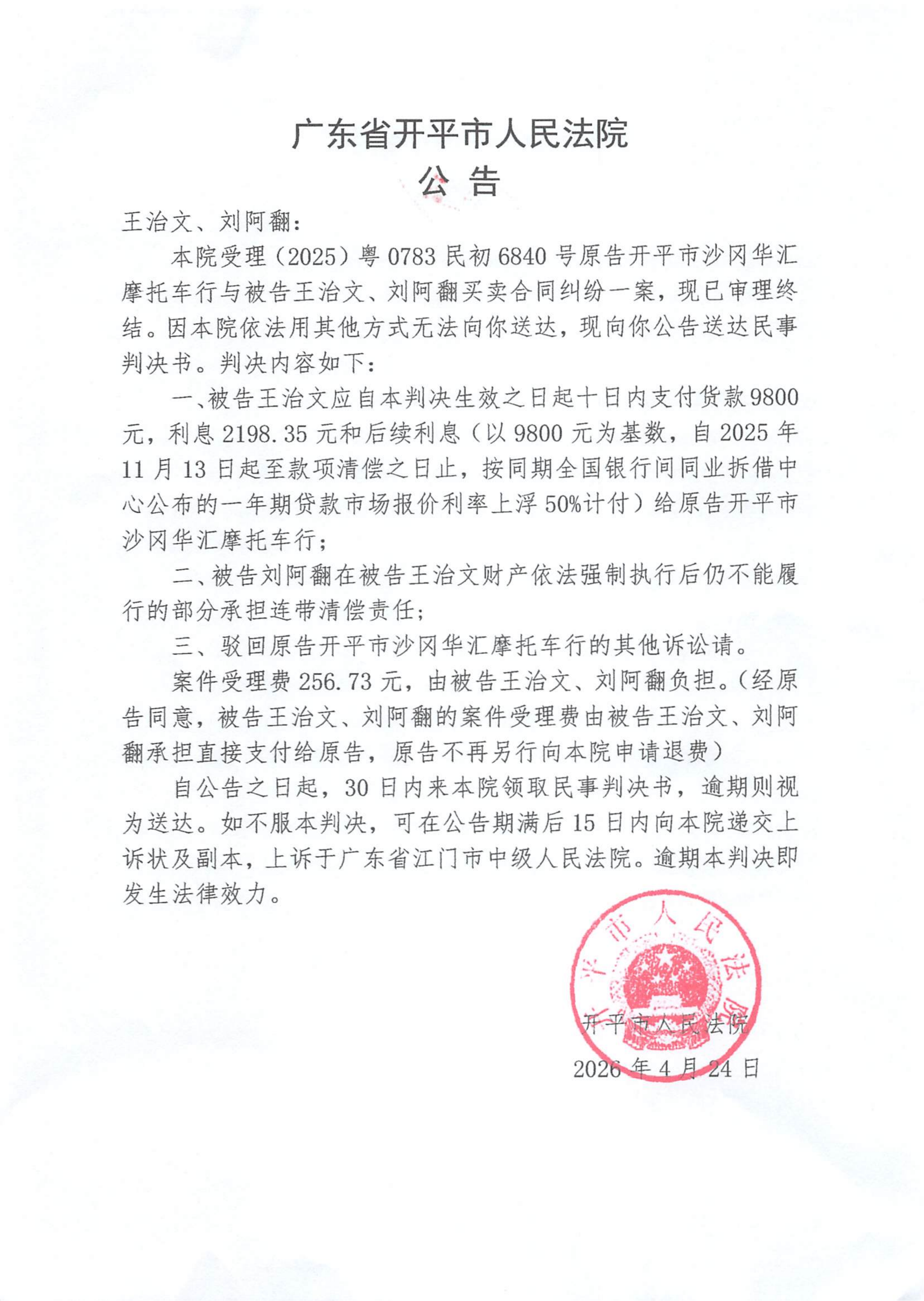 附件:(2025)粤0783民初6840号 王治文、刘阿翻 判决公告.pdf