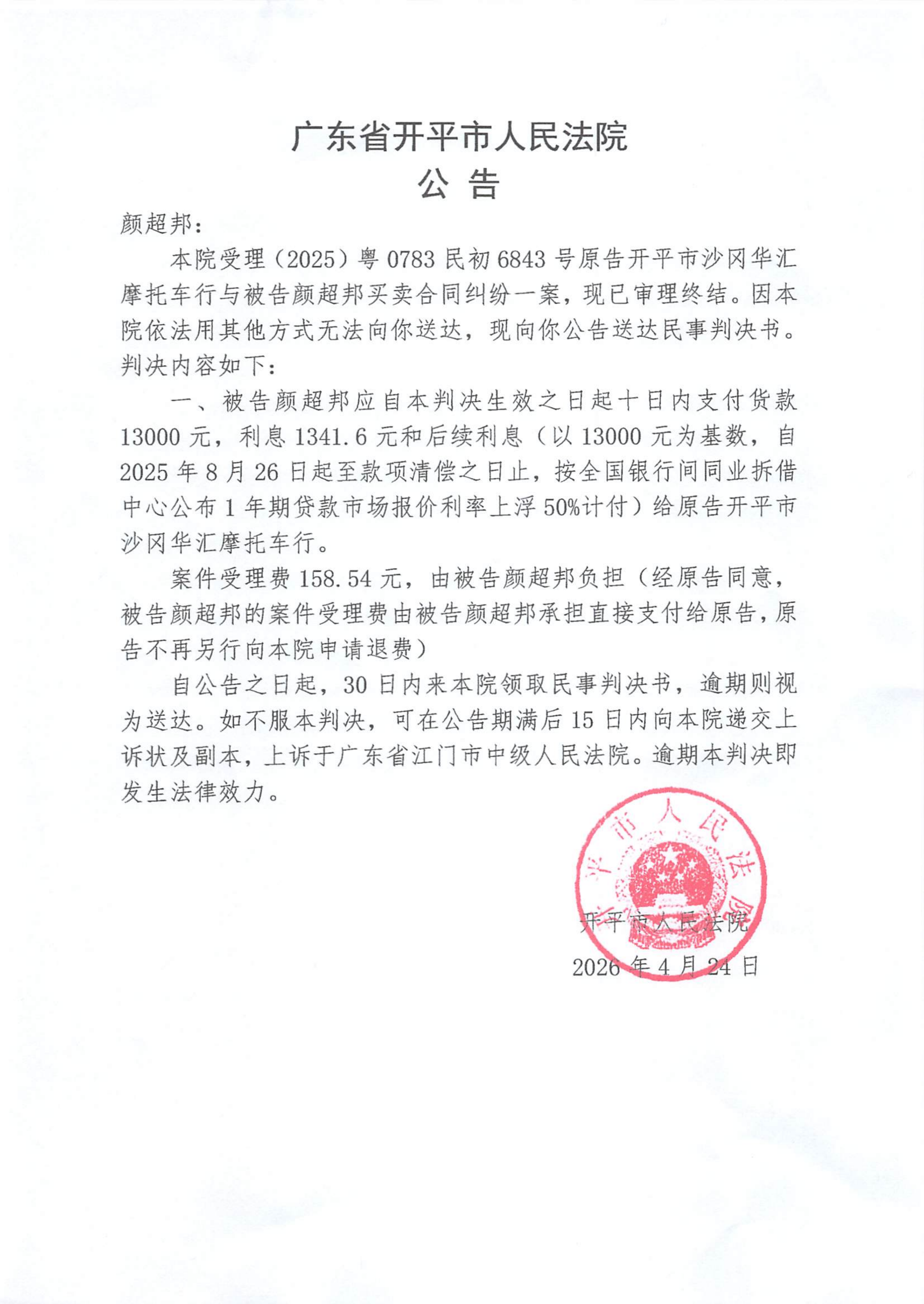 附件:(2025)粤0783民初6843号 颜超邦 判决公告.pdf