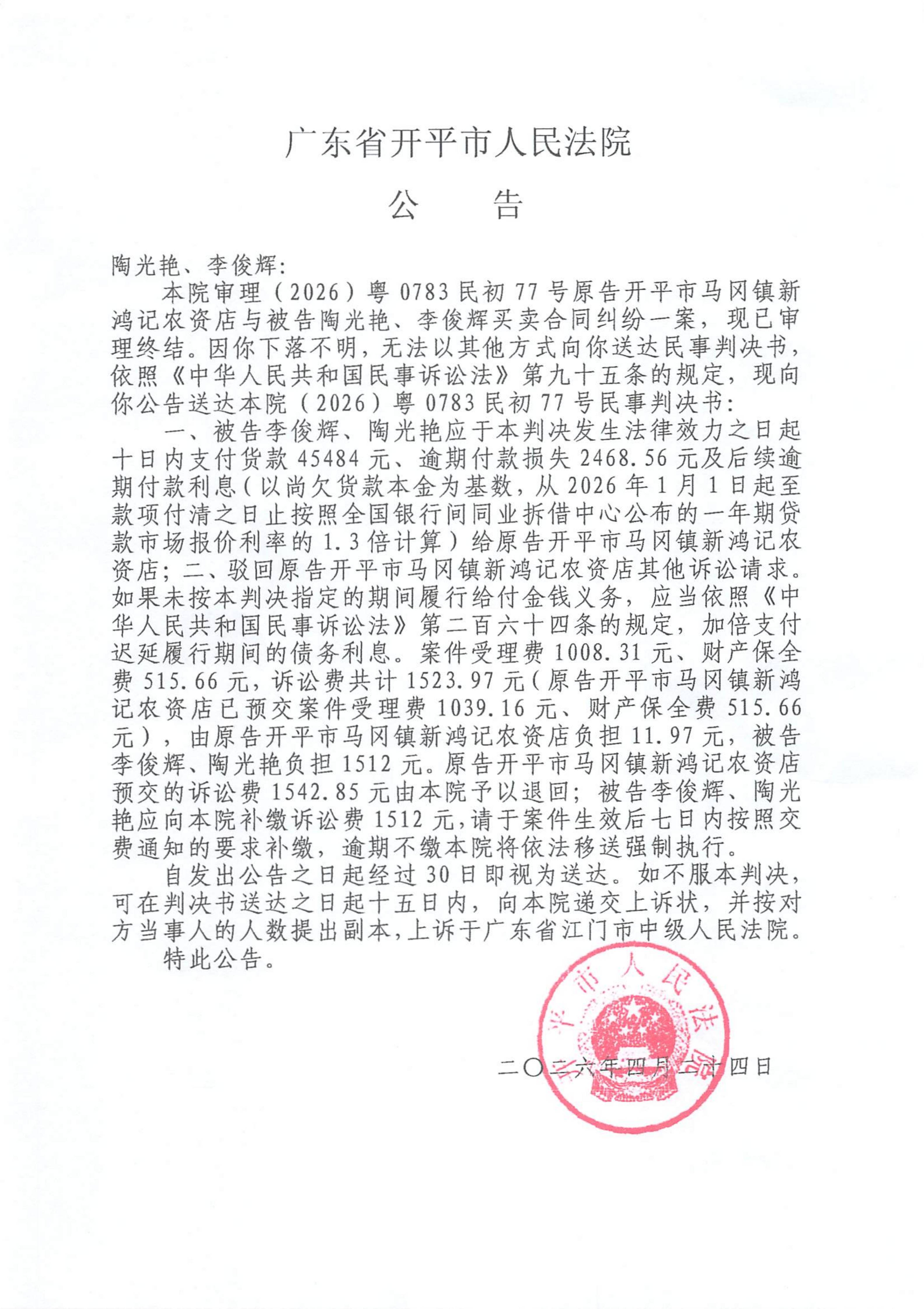 附件:(2026)粤0783民初77号 陶光艳、李俊辉 判决公告.pdf