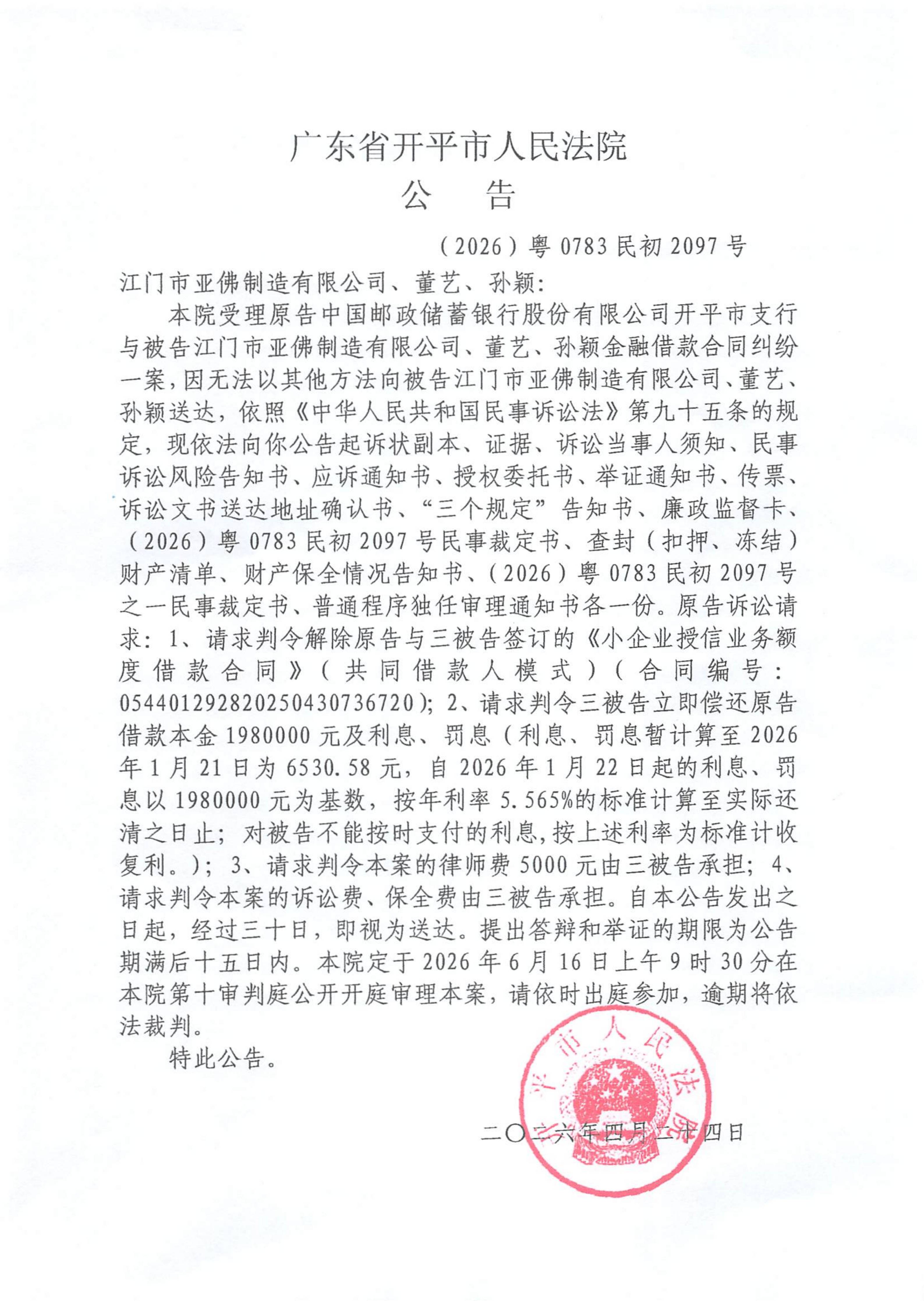 附件:(2026)粤0783民初2097号 江门市亚佛制造有限公司、董艺、孙颖 开庭公告.pdf