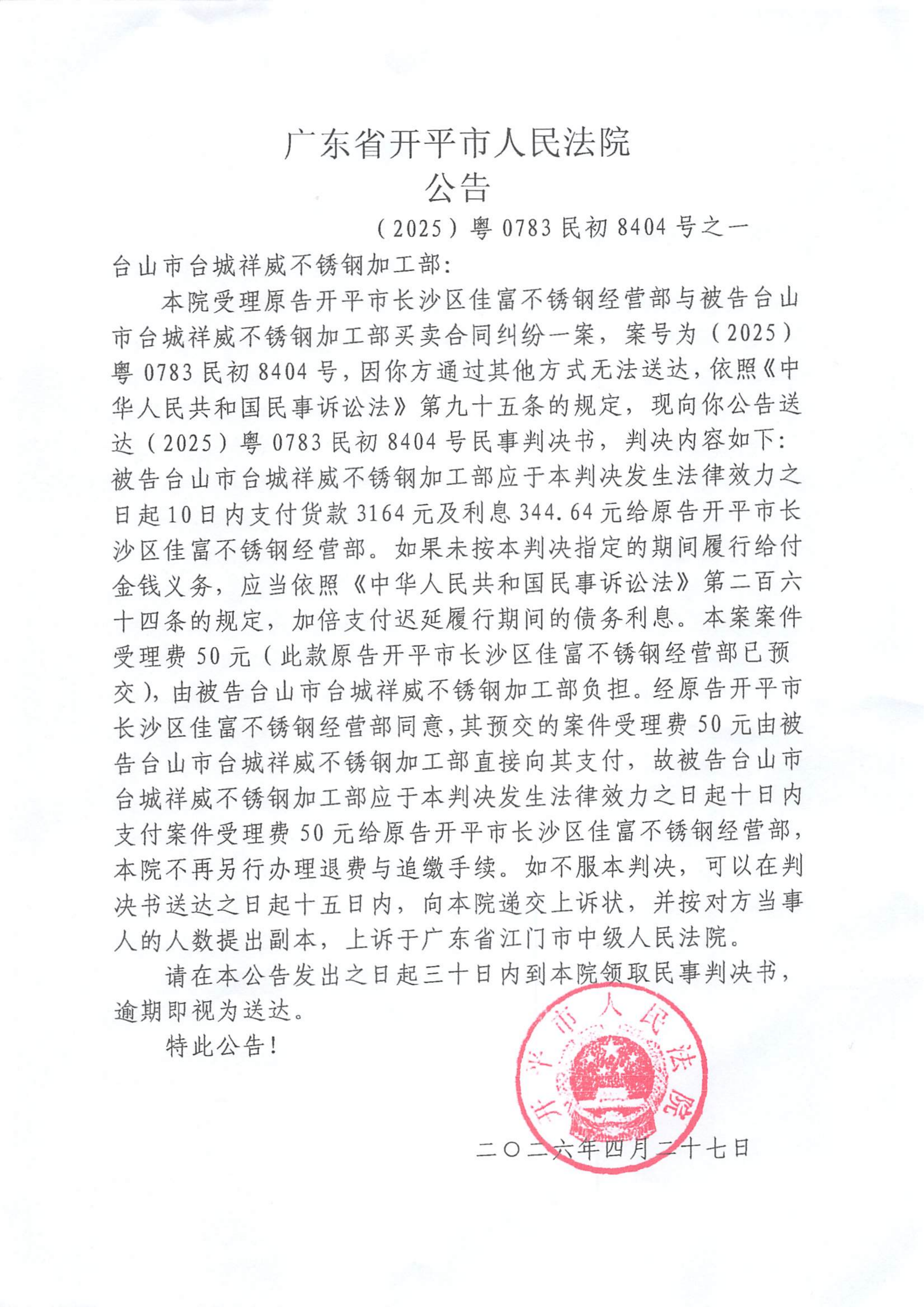 附件:(2025)粤0783民初8404号之一 台山市台城祥威不锈钢加工部 判决公告.pdf
