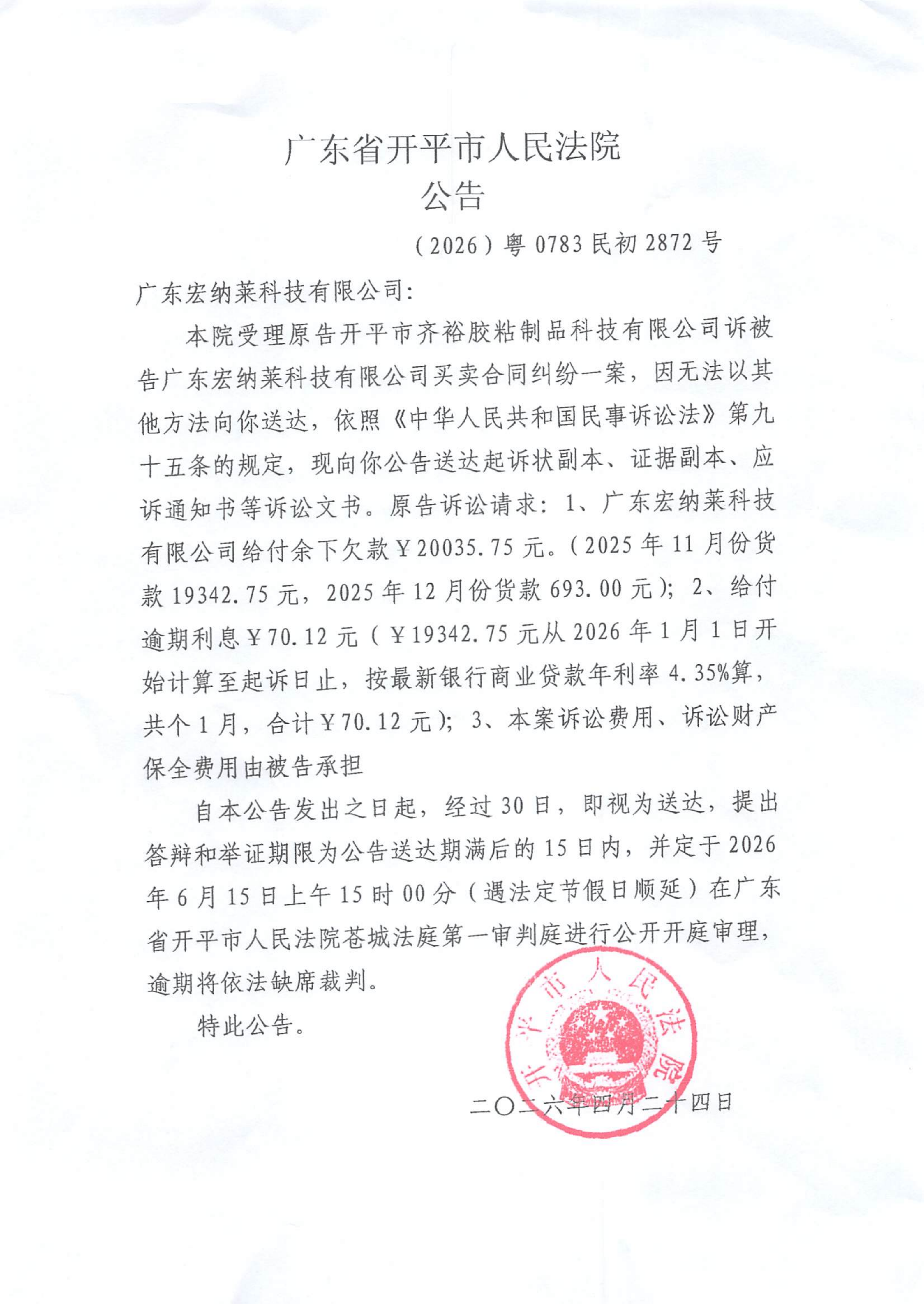 附件:(2026)粤0783民初2872号 广东宏纳莱科技有限公司 开庭公告.pdf