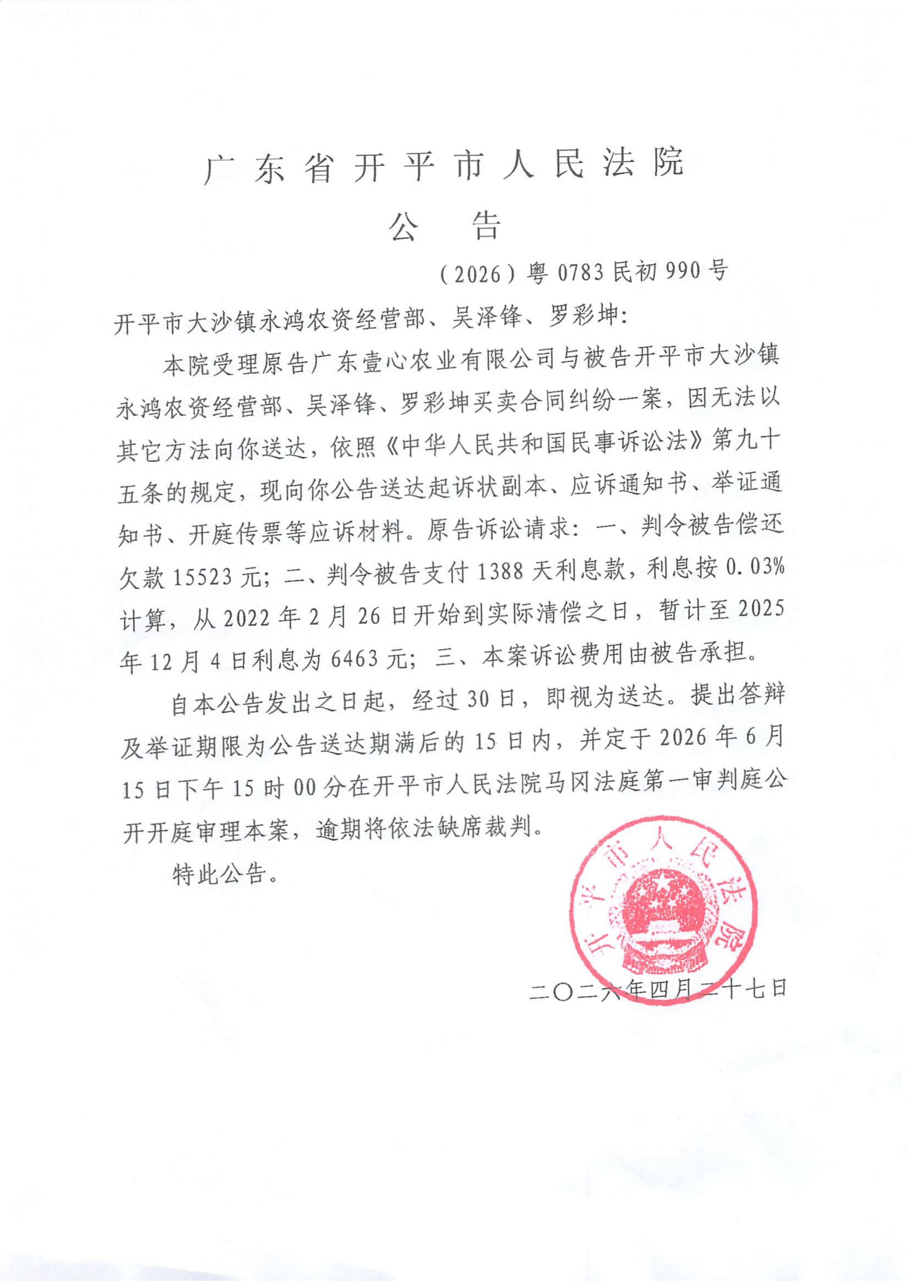 附件:(2026)粤0783民初990号 开平市大沙镇永鸿农资经营部、吴泽锋、罗彩坤 开庭公告.pdf