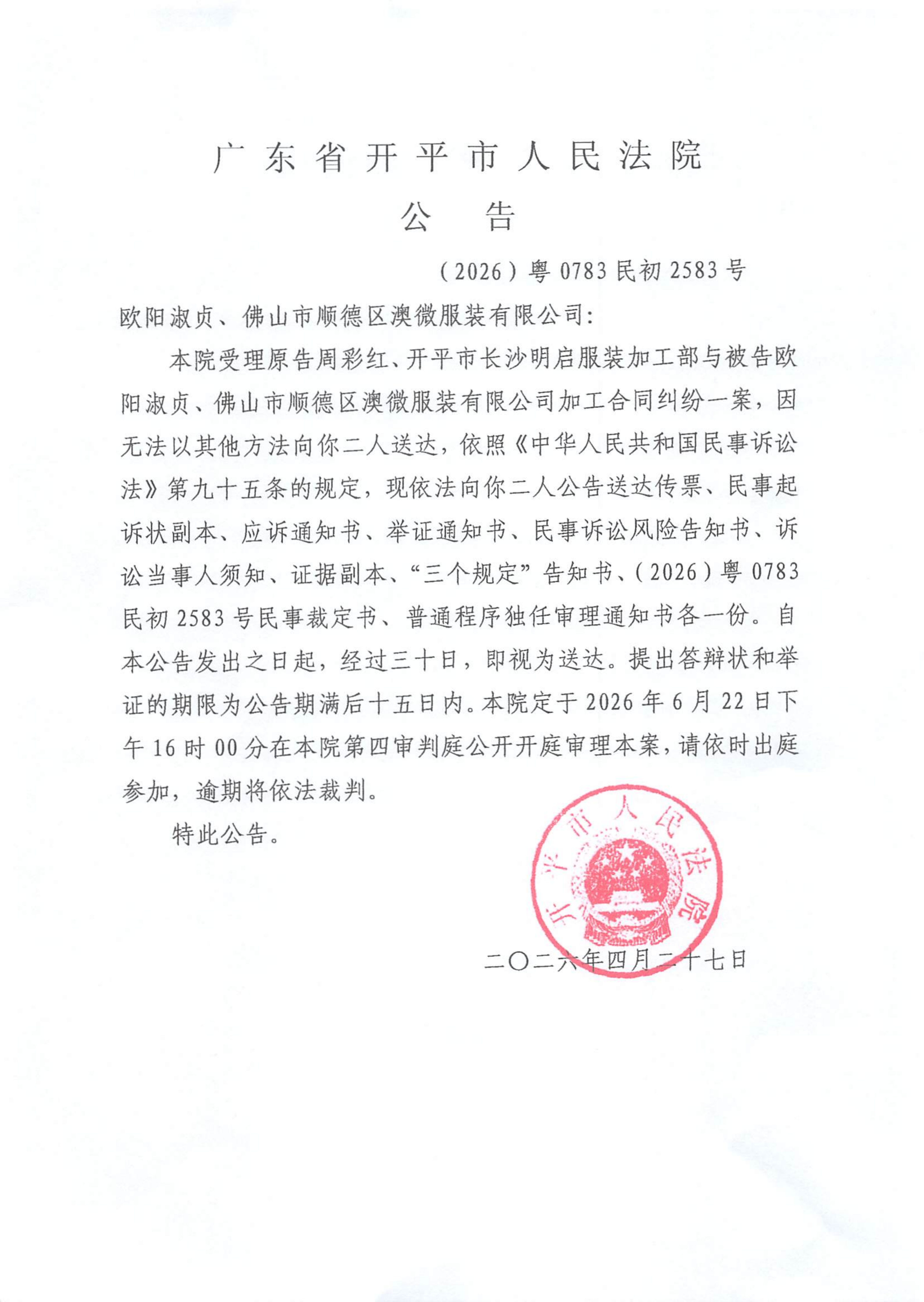 附件:(2026)粤0783民初2583号 欧阳淑贞、佛山市顺德区澳微服装有限公司 开庭公告.pdf